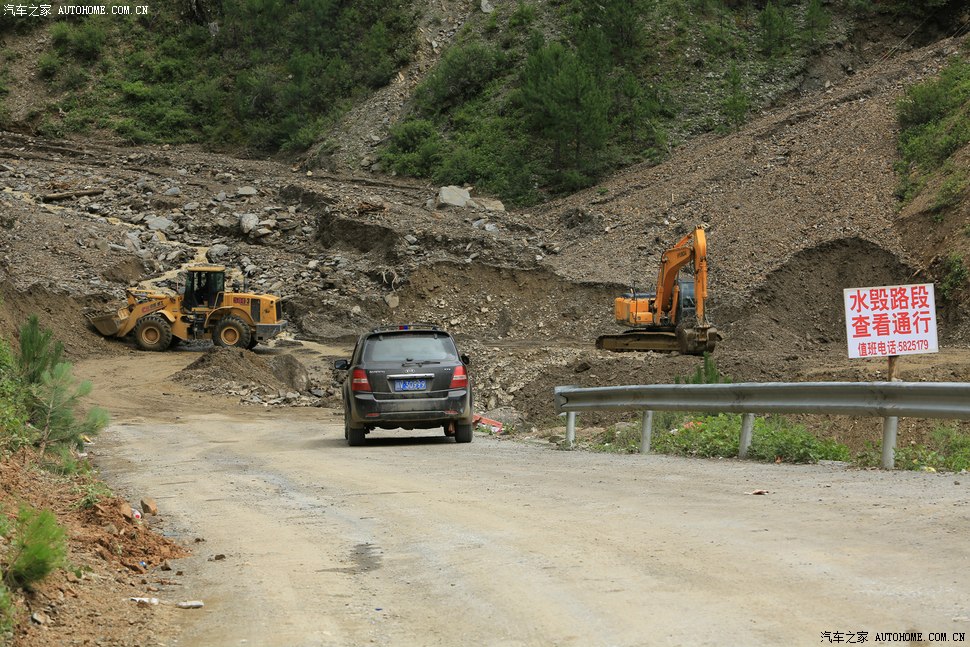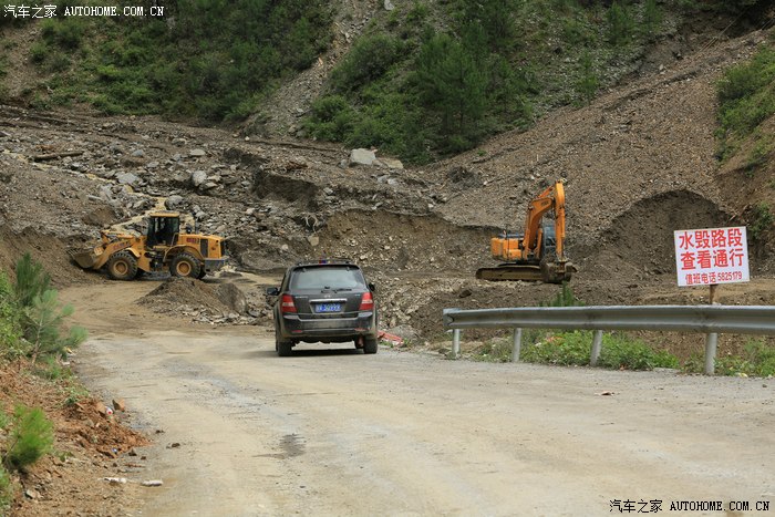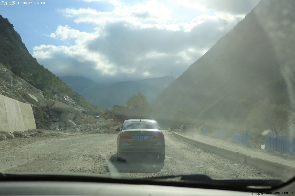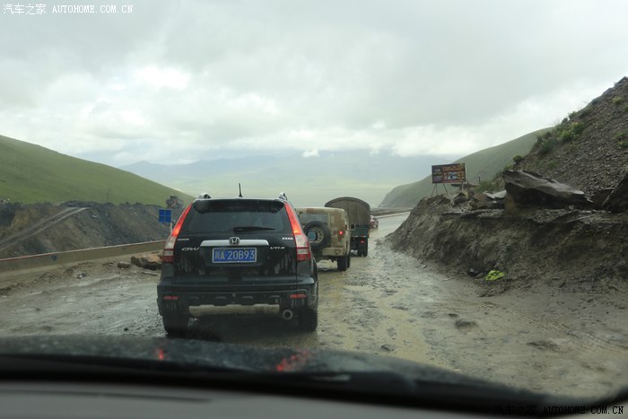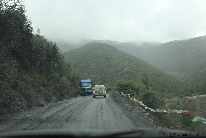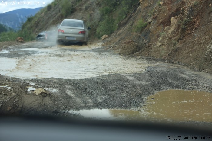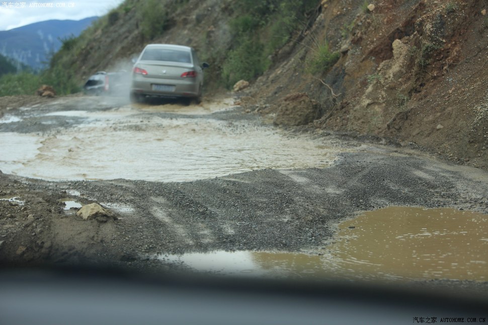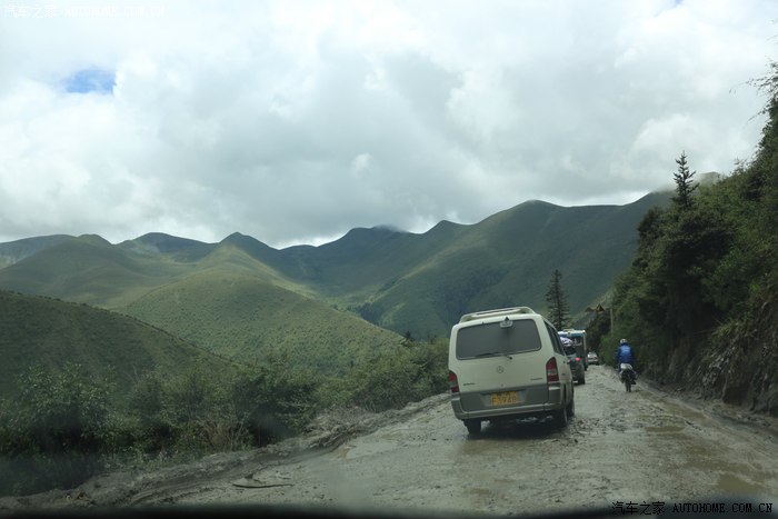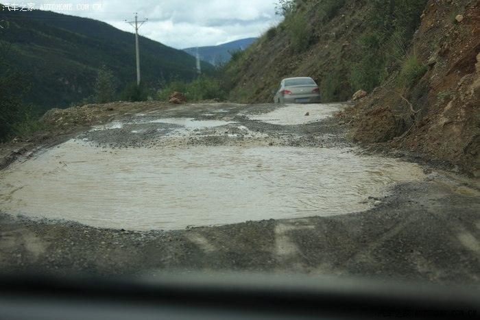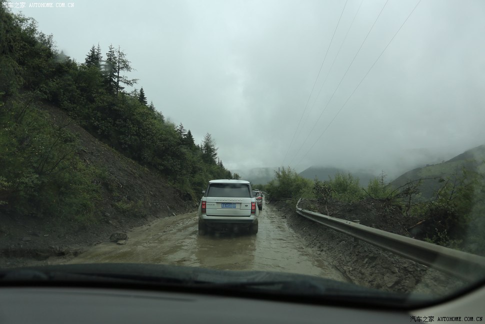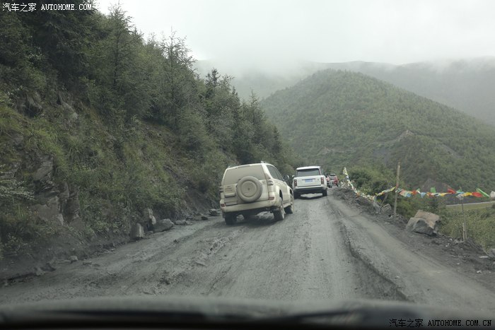 离开康定,过了新都桥镇之后,道路情况直线下降,柏油水泥路已经看不到它原本的模样,只剩坑坑洼洼的碎石路面,有的被大货车压得深陷了进去,坑洼很深,小车行进十分困难,雨依然在下着,且比之前雨势更大,车轮走过坑洼之处泥浆四溅,整体车速都降了下来,车也走得摇摇晃晃,颠颠簸簸,只能缓慢通过坑洼路面,否则可能会磕底或爆胎,可谓步步惊心,不敢想象在车来车往满是泥泞的318上换胎的艰辛,这种担心的心理折磨让人只想尽快结束这段烂路!但是,它却蜿蜒而没有尽头,似是对人车技和意志的考验,没有走过318的烂路就不算走过318!