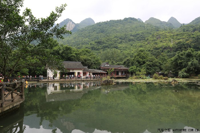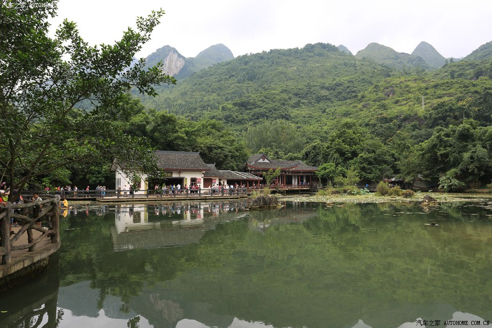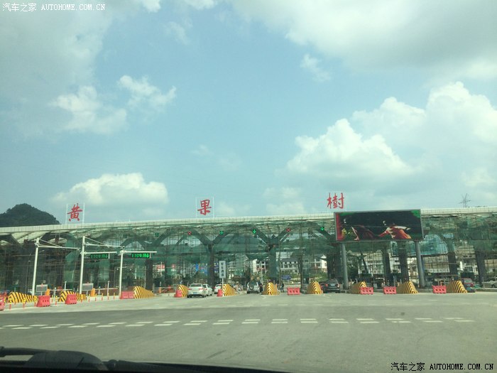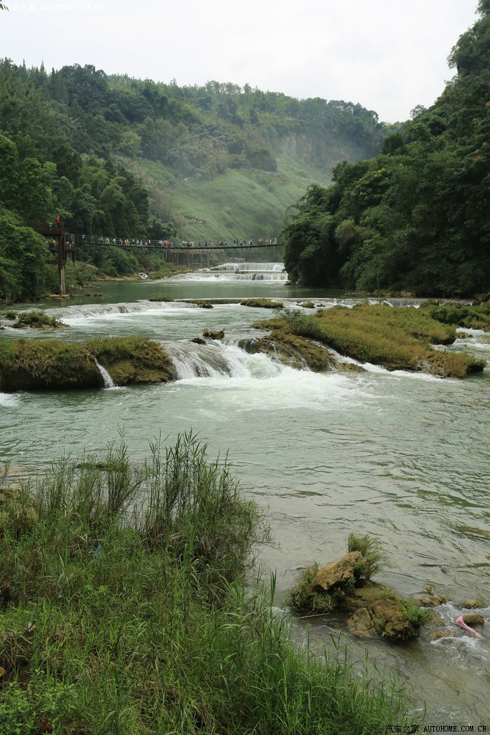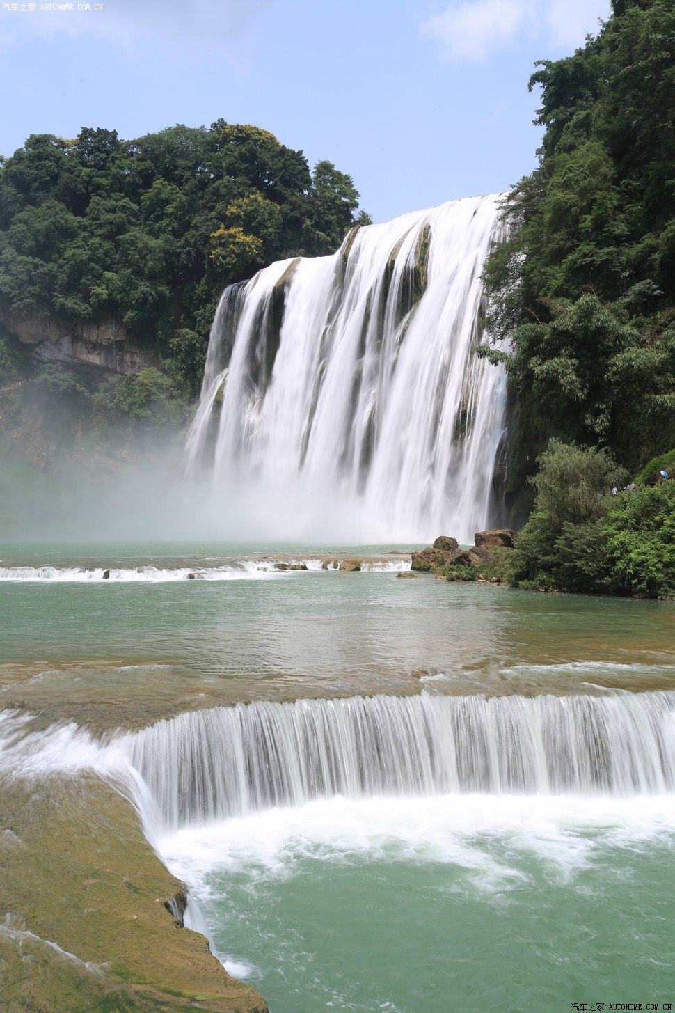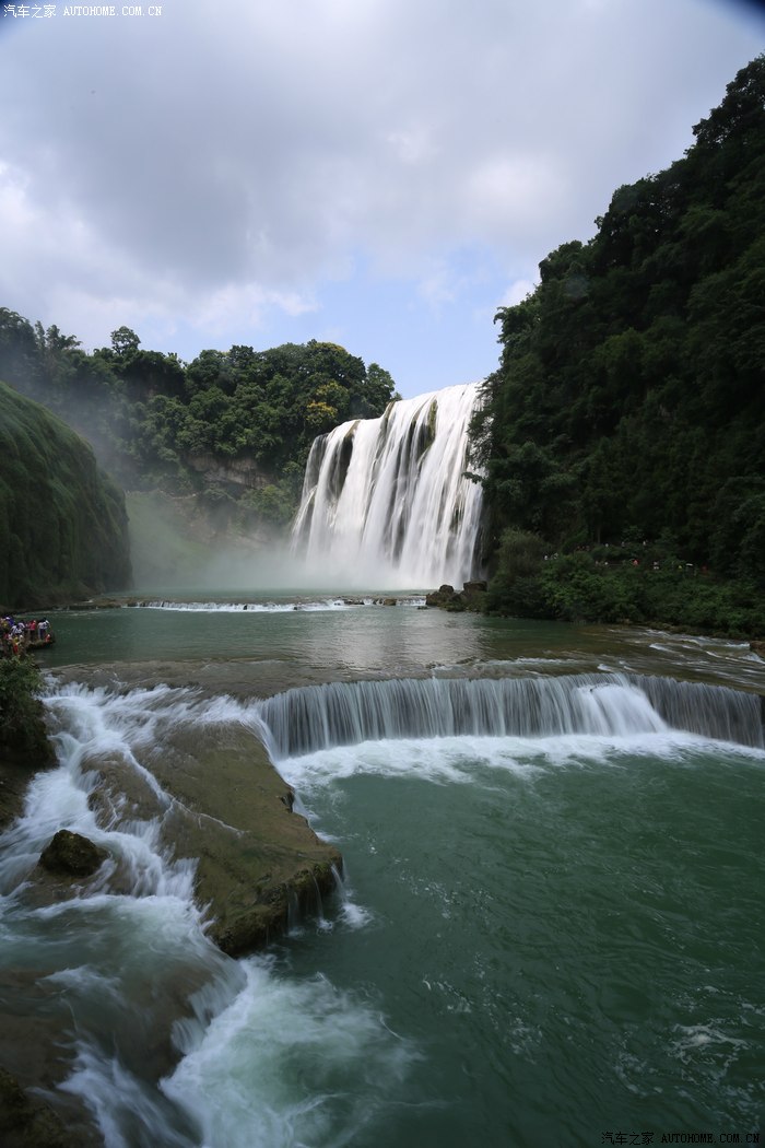 在大瀑布景区门口用过午饭便进入景区,先穿过盆景园,再乘坐大扶梯下到大瀑布景点,此时天依然阴阴的,但远远就能听到大瀑布的吼声,还未走近就可望见溅起一片白色水雾,越走近,水雾越大,像下起了蒙蒙小雨般,百米高的崖壁上,白色的水流飞流直下,伴着震天的咆哮声,气势磅礴,此时正值水量充沛时节,煞是壮观,虽然当年李白笔下的“飞流直下三千尺,疑是银河落九天”不是写的黄果树,但见到它的一刻,真正觉得来形容黄果树瀑布再恰当不过!一点多钟,太阳出来了,蓝天白云也渐渐可见,真是天公作美,阳光下的大瀑布更是耀眼壮观,白色的水流在阳光下熠熠生辉,似华丽的白色缎带垂挂于山壁,落于绿色的深潭中。 本打算去钻水帘洞,去瀑布的背后看看,但望望高处弯弯曲曲的台阶和满满的人流,不知道要走到什么时候去,且以我俩的体力估算玩完了肯定会挂掉,从观景台的角度看它已经很美很好了,遂打算折返。