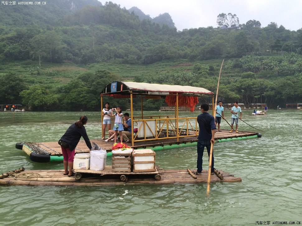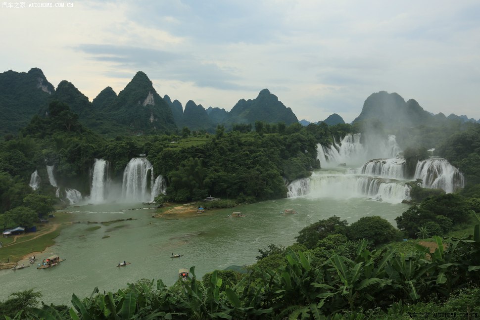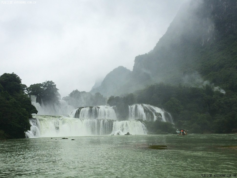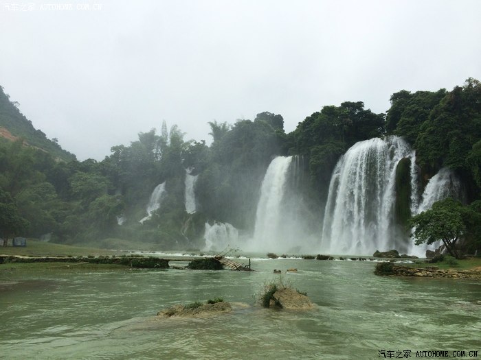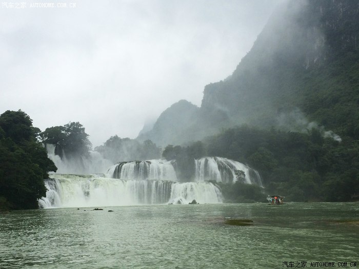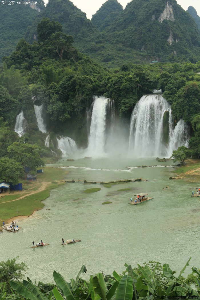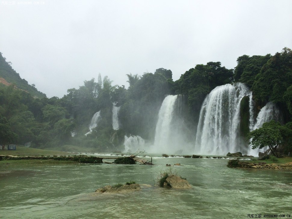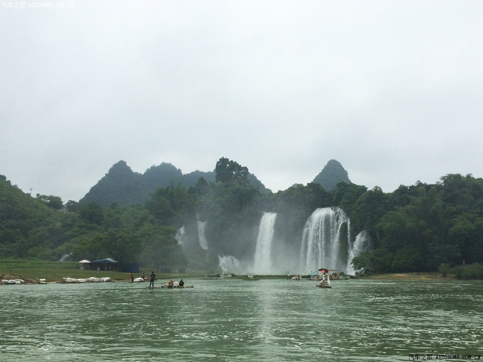 由于昨天到达是是阴天多云天气,早上本打算拍日出及晴天的景色,但天公依然不做美,还是阴天,远处山上雾气缭绕,瀑布也溅起了巨大的白色水汽,犹如仙境般朦胧,但依然水势汹汹,水声震耳,让它在秀美阴柔中又多了份阳刚之气,沿栈道往下,到达了乘坐竹筏的点,可以划到河中央与瀑布近距离接触,越靠近瀑布,水汽越大,扑面而来,头发,脸上全是湿湿的小水珠,对岸越南的小商贩划着小竹筏过来兜售货品,竹筏上放着泡沫箱子,里面装着各种手链,香水等,靠着游客的大竹筏叫卖,可以还价,且价格便宜。