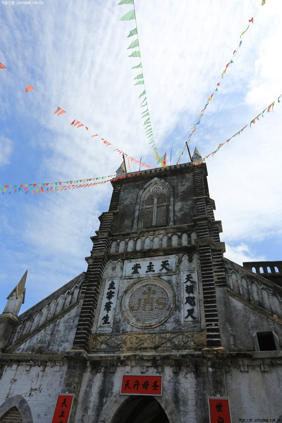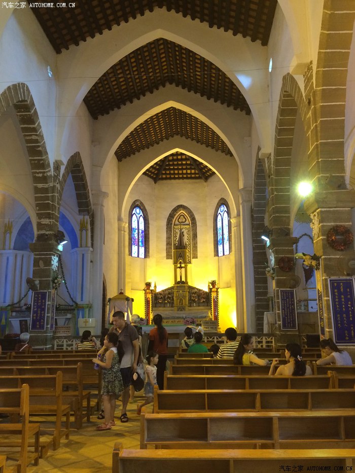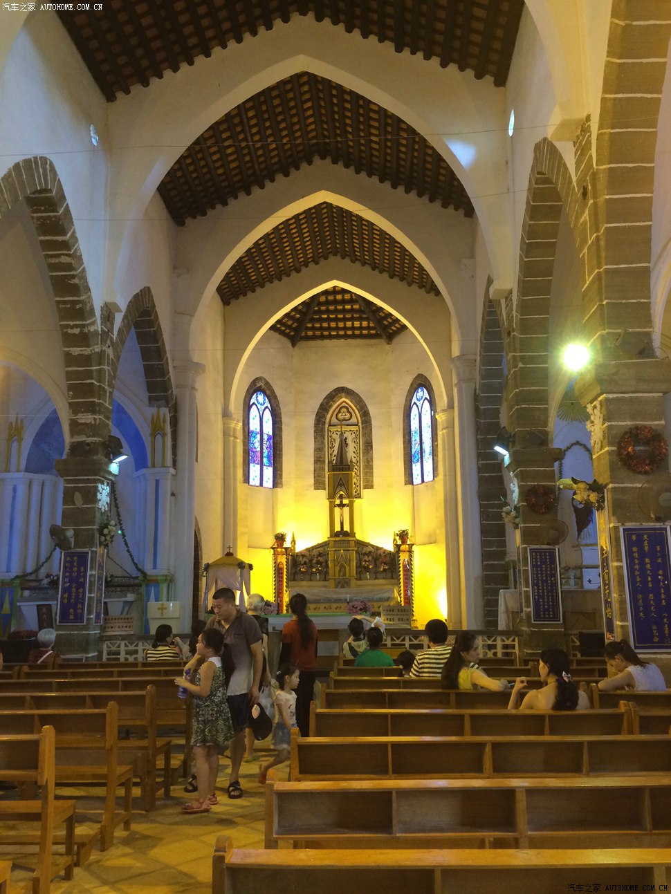 出来后继续开往天主教堂,这里的路有的地方不是很好走,道路也窄,毕竟还未完全开发,有些地方还是比较原生态的。在一片遮阳伞摊铺后就是教堂了,黑白的建筑, 高高地伫立着,白墙由于年代久远晕染着黑色,整体看着肃穆庄严,这是第一次进教堂,还是比较好奇的,一排排座椅,拱形的窗户和彩窗,就是这里成为景点后,游人来来往往不断,进来都必会拍照,导致完全没有做祷告那种肃穆的感觉啊,没多久就出来了。