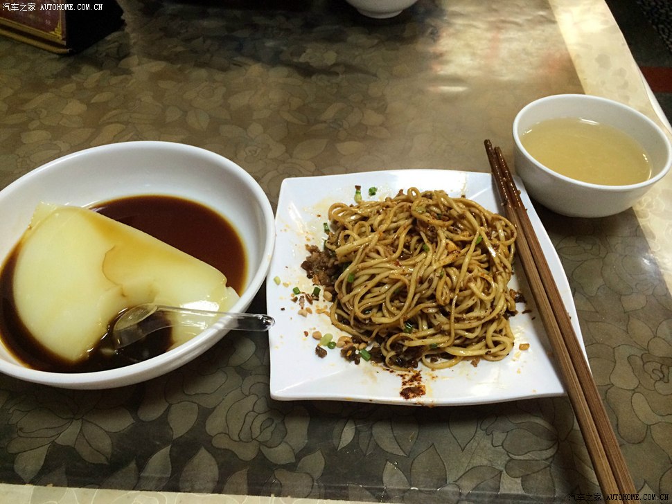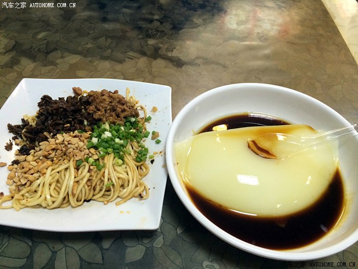 早起,想去尝尝人民路上著名的宜宾燃面,开车兜兜转转,没有停车的地方,历经波折,最终乘坐出租车到达,原来,因楼房翻修,处于一楼的门面隐藏在脚手架和灰绿的防护网中,只有一块小小旧旧的“宜宾燃面”招牌随意的放在了脚手架上,真是难找啊!进店,当然要点燃面,荤燃面加本地特色凉糕。不一会,凉糕、燃面陆续上桌,燃面,一盘约一两左右的份量,上面撒有花生末,肉末,腌菜末,葱花,搅拌均匀后,面条色泽油亮,其间混合着肉末花生腌菜葱花,鲜香无比,味道丰富之极,整体感觉还是比较荤的,可喝上一口素汤解腻。凉糕,看着像布丁一般,浸在浓浓的红糖水中,入口凉凉的,爽滑极了,吃完微微有些辣的燃面,再吃上两口凉糕,简直是绝配!