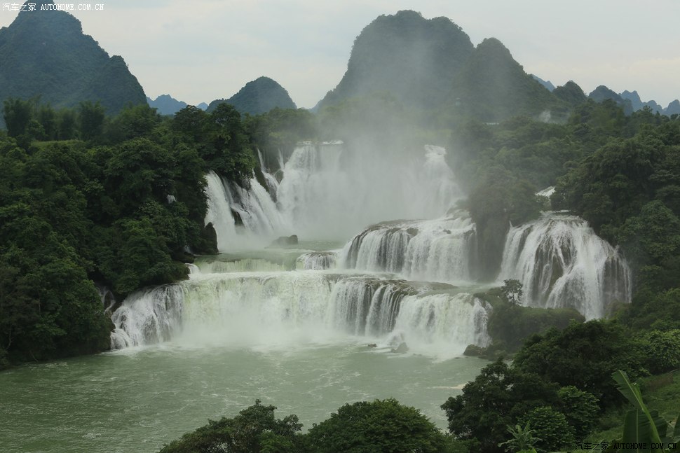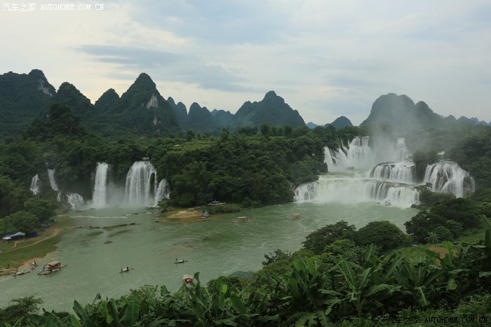 下午约四点到达,靖西到德天瀑布的高速还未开通,只能走国道,到路上风景宜人,有着小桂林的风貌,远处一座座山包连绵,除了缺点水,极具桂林特色,路边是一片片农田。到达景区后找了景区内的宾馆—德天山庄,这样下午和明天一早都能游览瀑布了。办理好入住手续后就开始不慌不忙地游览瀑布,瀑布就在景区入口处,一进景区就有一个观景台,碧绿的归春河成了天然的界河,秀美壮观的德天瀑布水量充沛,从崖壁上奔涌而下,遇到下方的山崖岩壁,段成三级,层层往下,煞是壮美,旁边的小瀑在越南,几条白色的缎带悬于山壁,与旁边的德天大瀑布比较起来,显得小巧别致,远处是一座座高耸的青山,河边是绿油油的梯田,河岸边植被丰富,各种热带植物生长茂盛,不过只认得出香蕉树这一种。往景观大道向里走,还有多处观景点,离瀑布也越来越近,水声越大响亮,气势更为壮阔。