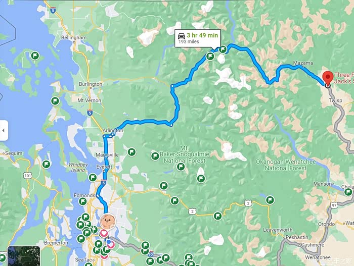 这条路线是从西雅图的贝尔维尤Bellevue出发到温斯洛普Winthrop,中间穿越著名的North Cascades森林公园,比较著名的景点有Newhalem,Gorge Dam,Diablo Lake,Ross Lake,Washington Pass等,其中可供越野徒步的步道多到数不胜数,其中一条比较有名的步道入口的路边,停了几百台各式车辆。