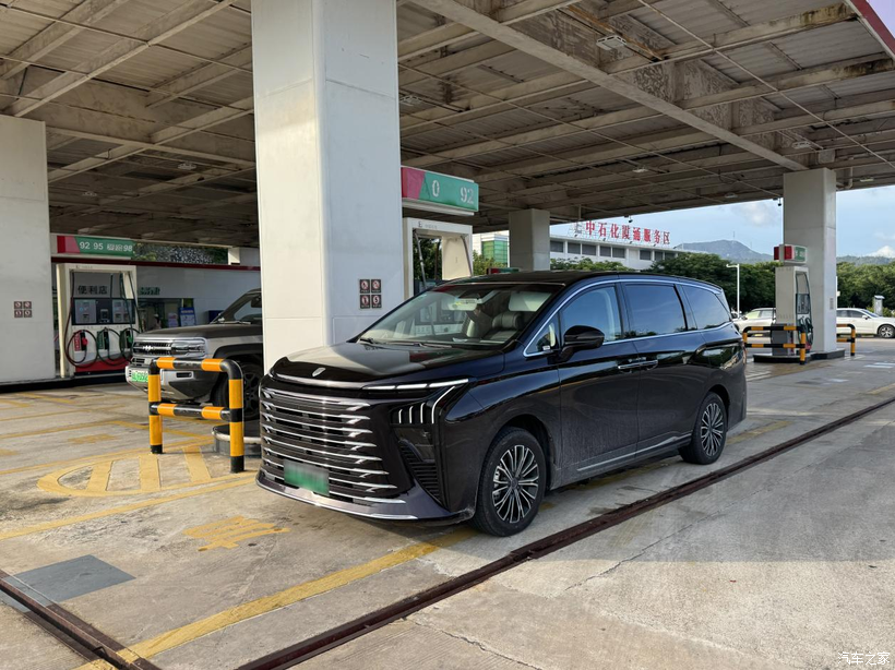 我也搞不懂为什么,每次一上车没多久我家小孩就要上厕所,次次都是,又得先到服务区停着。这次来回大概400km,充一次电跑单程都不够,我也不想花太多时间找充电站充电,索性就在这里加了200块钱的油,这一去一回差不多就够用了。