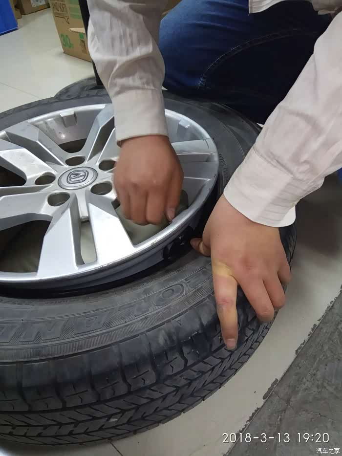 先把轮胎拆下来,放完气,卡在一个小的地方,用千斤顶把轮胎压下去一个地方,然后四周用脚踩下去。
