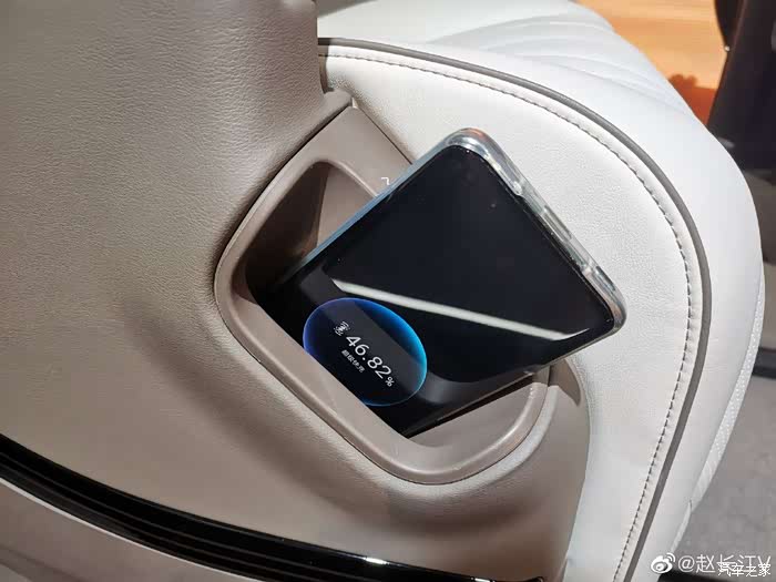 腾势D9车内配备三个50w无线快充,其中二排座椅两侧各一个,手机放入充电位以后,二排屏幕会提示您已经充电。