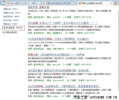 2、其次说明,关于汽车车内异响问题,这个可以说任何车都有,车子的普遍现象,没有异响的车可以说还没有(纯手工打造的可能没有。。。)只是严重程度、频繁程度、触发条件的难易度不同而已。随便在网上输入你想关注的车型,然后在后边写上异响两个字,100%任何车都有,为了证明我说的,我在汽车之家论坛,随便输入了个“宝马 异响”马上出来一堆,大概2000多个发帖求助的。
