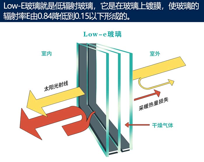 Low-E膜层中镀有银层,银可将98%以上的远红外热辐射反射出去,从而像镜子反射光线一样直接反射热量。Low-E的遮阳系数Sc可从0.2至0.7,从而可根据需要调控进入室内的太阳直接辐射能。