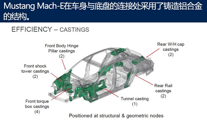 并且呢,为了让车辆在动态行驶有更少的振动向车内传播,以及车体联接强度,Mustang Mach-E在车身与底盘的连接处采用了铸造铝合金的结构。铸造铝合金的前后塔座设计,既能实现车身轻量化设计、提升安装点的刚性支撑,也能最大化提升安装点的动态刚度,从而保证车体与底盘零件不发生共振,优化路面传递来的振动和噪音,让NVH相关机械素质更好,提升舒适性。