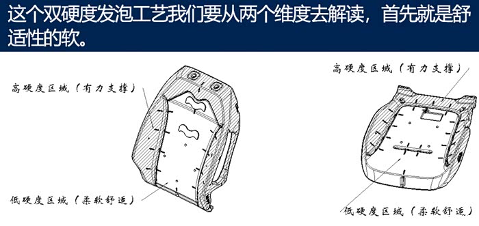 柔软的坐垫为低硬度区域,采用软性泡沫发泡工艺,以减少颠簸时对腰骶部的碰撞,减轻震动传递,提升舒适度。
