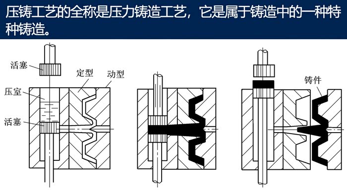 通过将熔融状态或半熔融状态的金属浇注入压铸机的压室,在高压的作用下,使金属液高速度充填在压铸模具的型腔内,并在高压下使熔融或半熔融的金属冷却凝固成形而获得铸件的高效益,高效率的精密铸造方法。