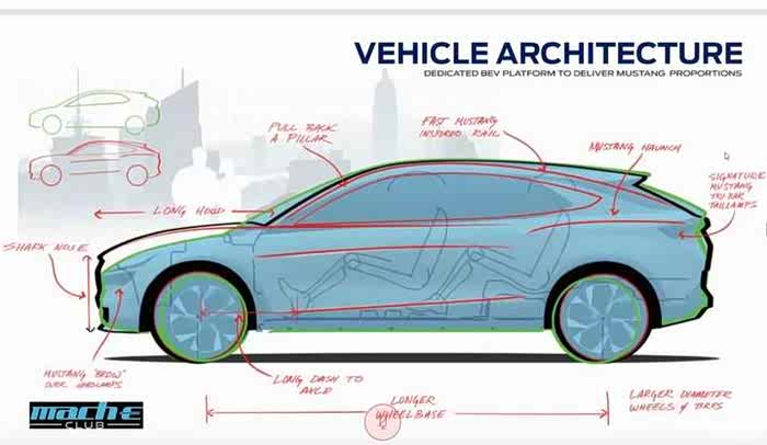 相较于Mustang跑车,Mustang Mach-E整个前机舱的高度被进一步抬高变平,车顶后部的线条则进一步倾斜,营造出Mustang经典的快背(Fastback)造型。