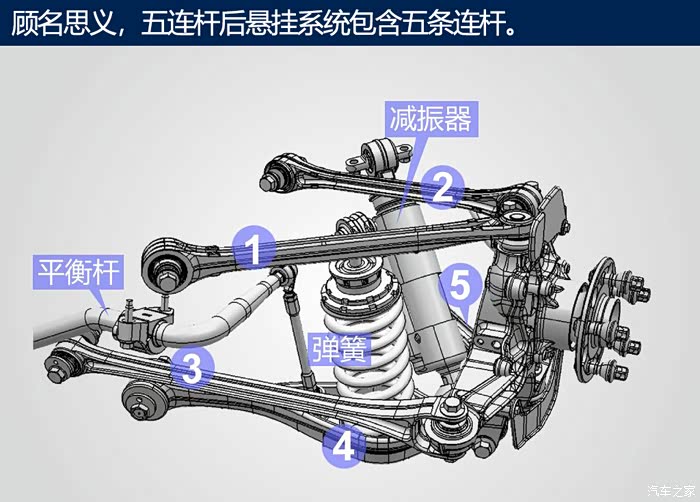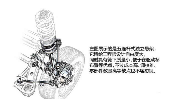 5连杆后悬架能实现主销后倾角的最佳位置,大幅度减少路面来的前后方向力,从而改善加速和制动时的平顺性和舒适性。