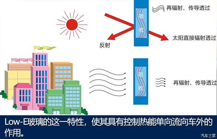 并且,太阳光短波透过玻璃后,照射到车内的物品上,这些物品被加热后,将以长波的形式再次辐射。这些长波被Low-E玻璃阻挡,返回到车内。事实上通过玻璃再次辐射被减少到85%,极大地改善了玻璃绝热性能。