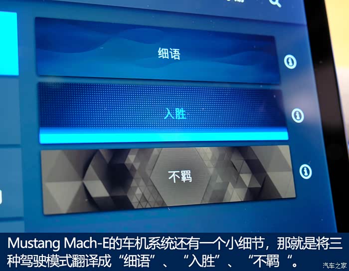 Mustang Mach-E的车机系统还有一个非常具有中国特色的小细节,那就是将三种驾驶模式翻译成“细语”、“入胜”、“不羁“。你很难想像一部如此现代的车型内部居然还有古典元素的加持,这种文化的融合感会进一步增强Mustang Mach-E的个性。