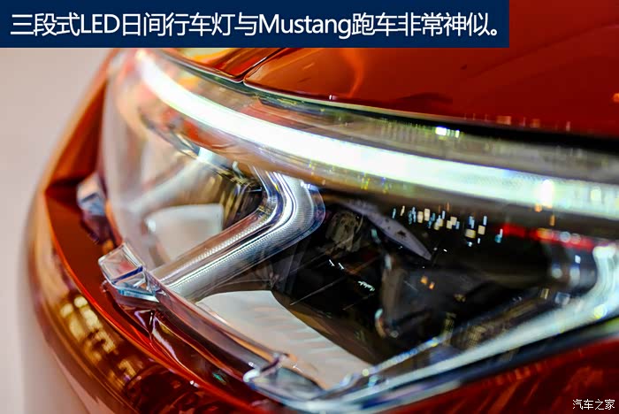 除此之外,作为点睛之笔,三段式LED日间行车灯与Mustang跑车非常神似,点亮后也颇具辨识度。