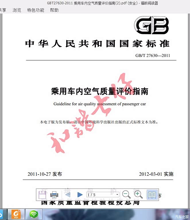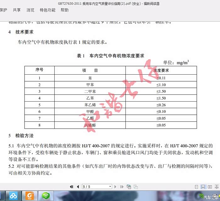 测试标准:《GB 27630-2011乘用车内空气质量评价指南》