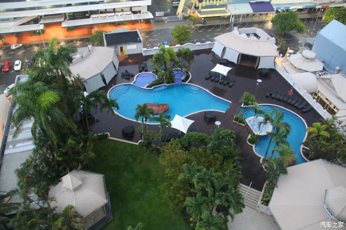 机场搭的士去宾馆,7公里左右。把澳币(1澳币当5人民币)当人民币看就行,3.5澳币起价,每公里3澳币。下榻所谓5星级的Pullman Cairns International(凯恩斯铂尔曼国际大酒店)。真心话,其相比中国5星级酒店相差太多。此前曾闻全球最好酒店在中国一说,在此得到一定印证。