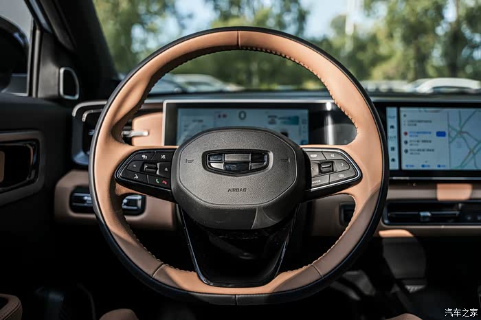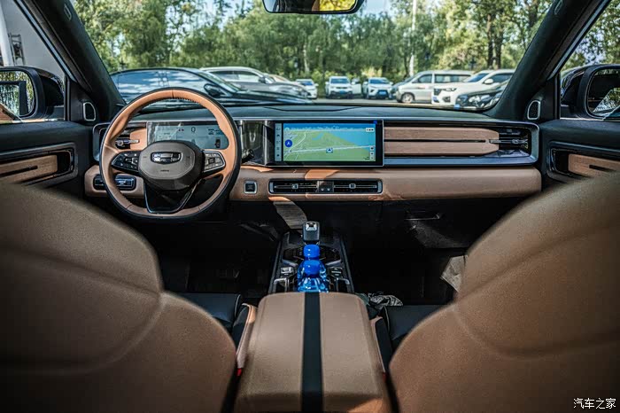 内饰里面是棕黑色的搭配,是比较运动风的感觉,官方的名字叫做“咖啡生巧”,还有一种内饰叫做“纯真白巧”,是白粉色的。中控台上是一个12.3英寸中控屏+10.25全液晶仪表盘的双联屏设计,可以说是蛮先进的了。