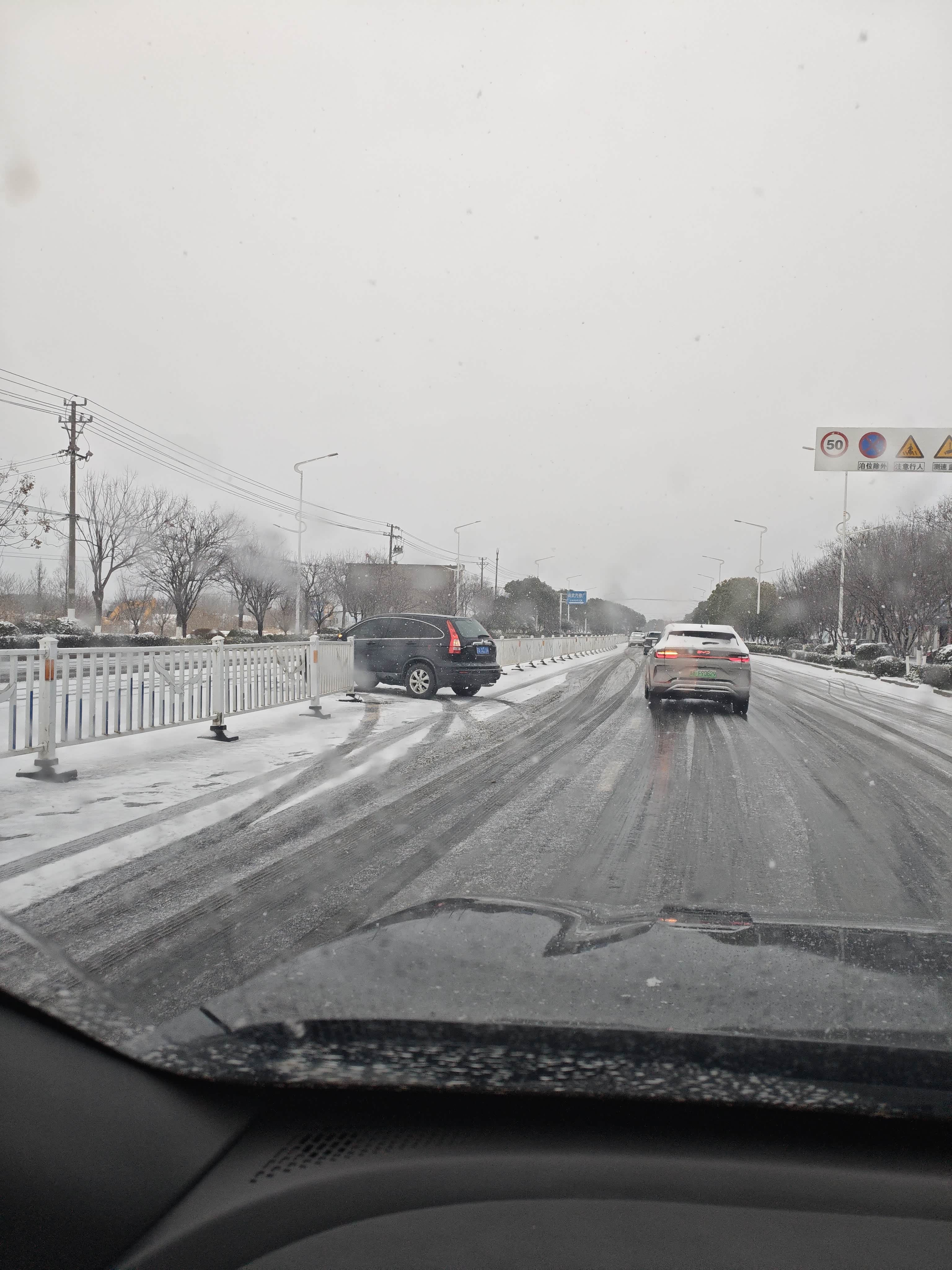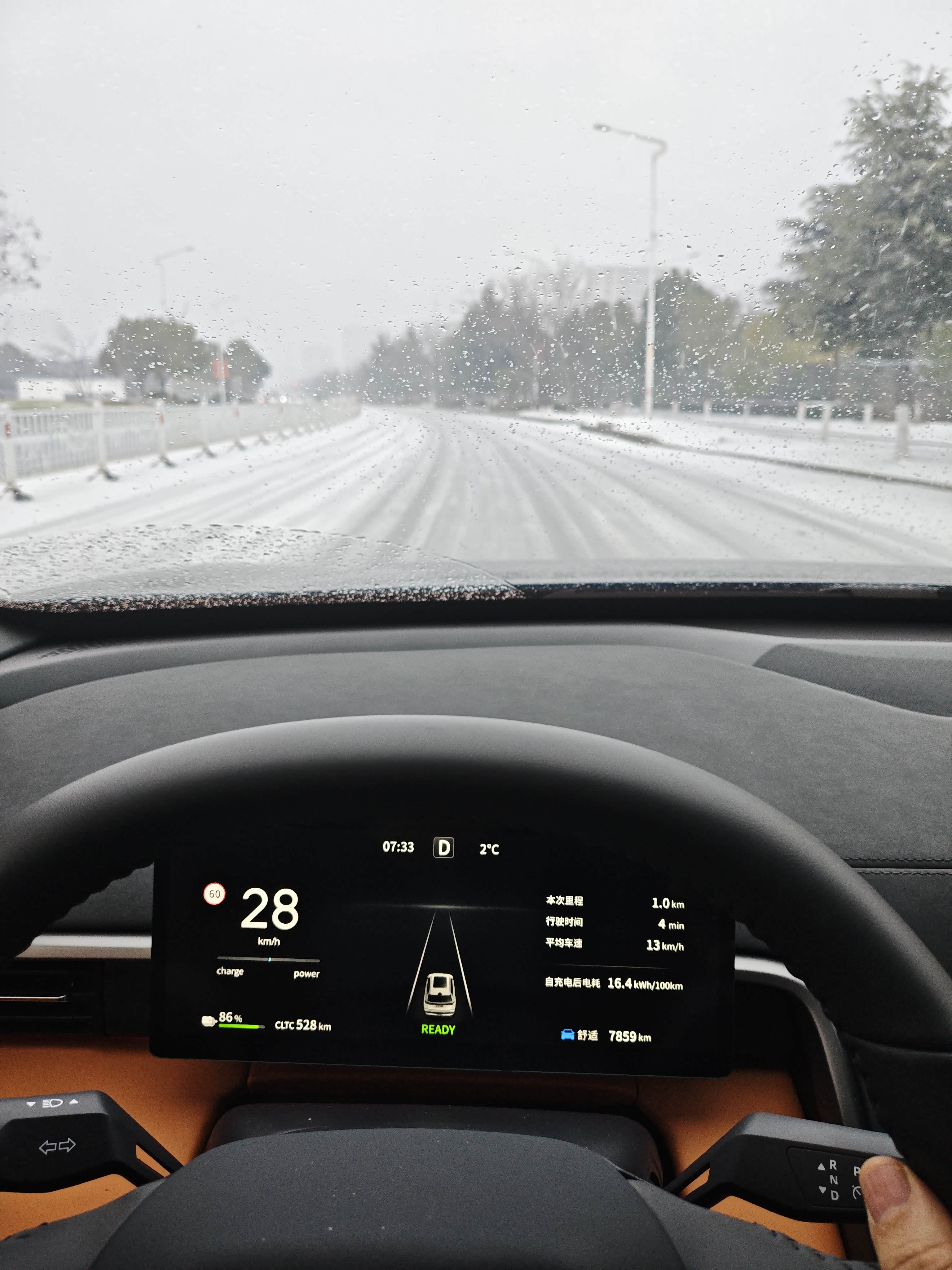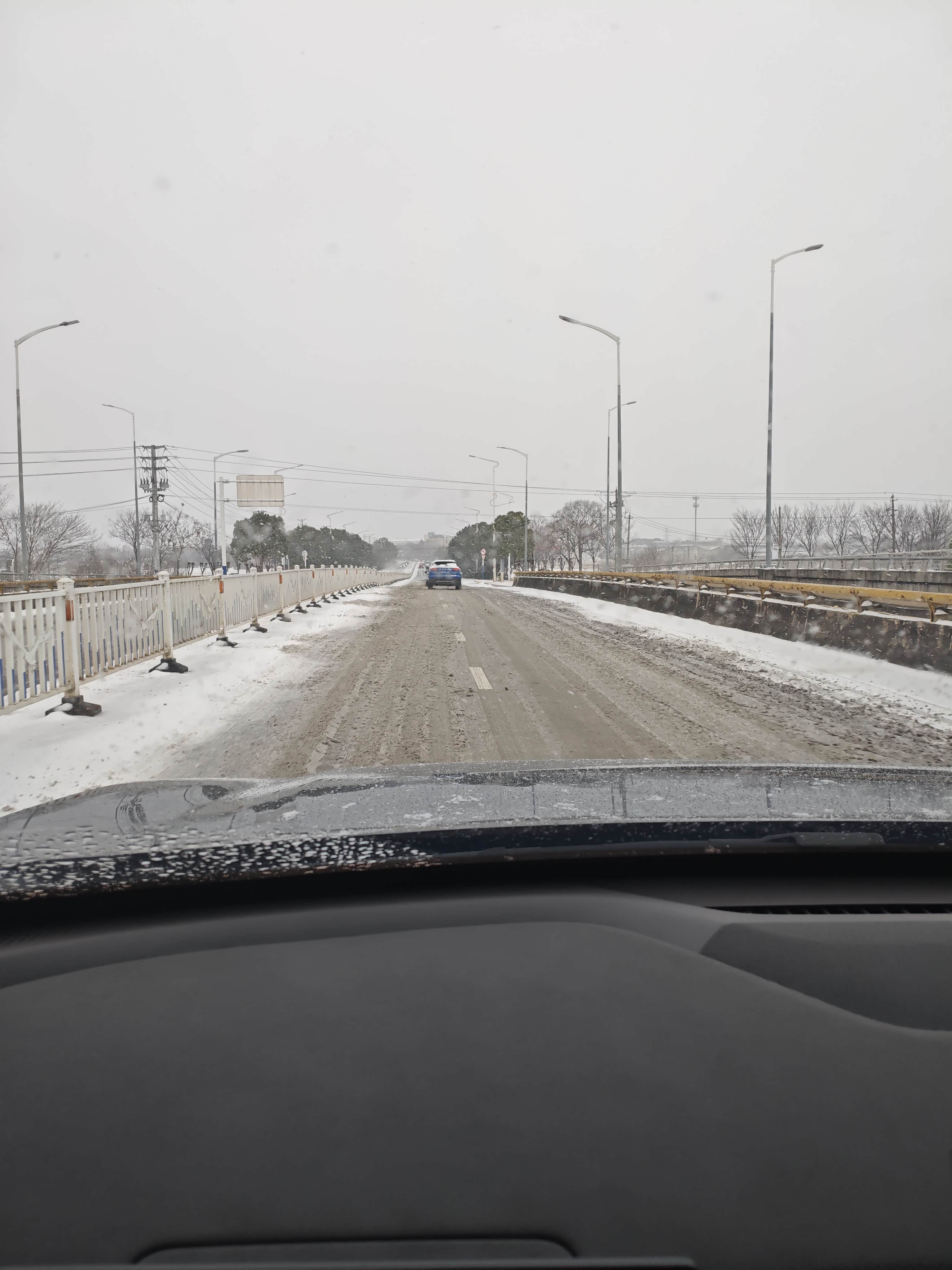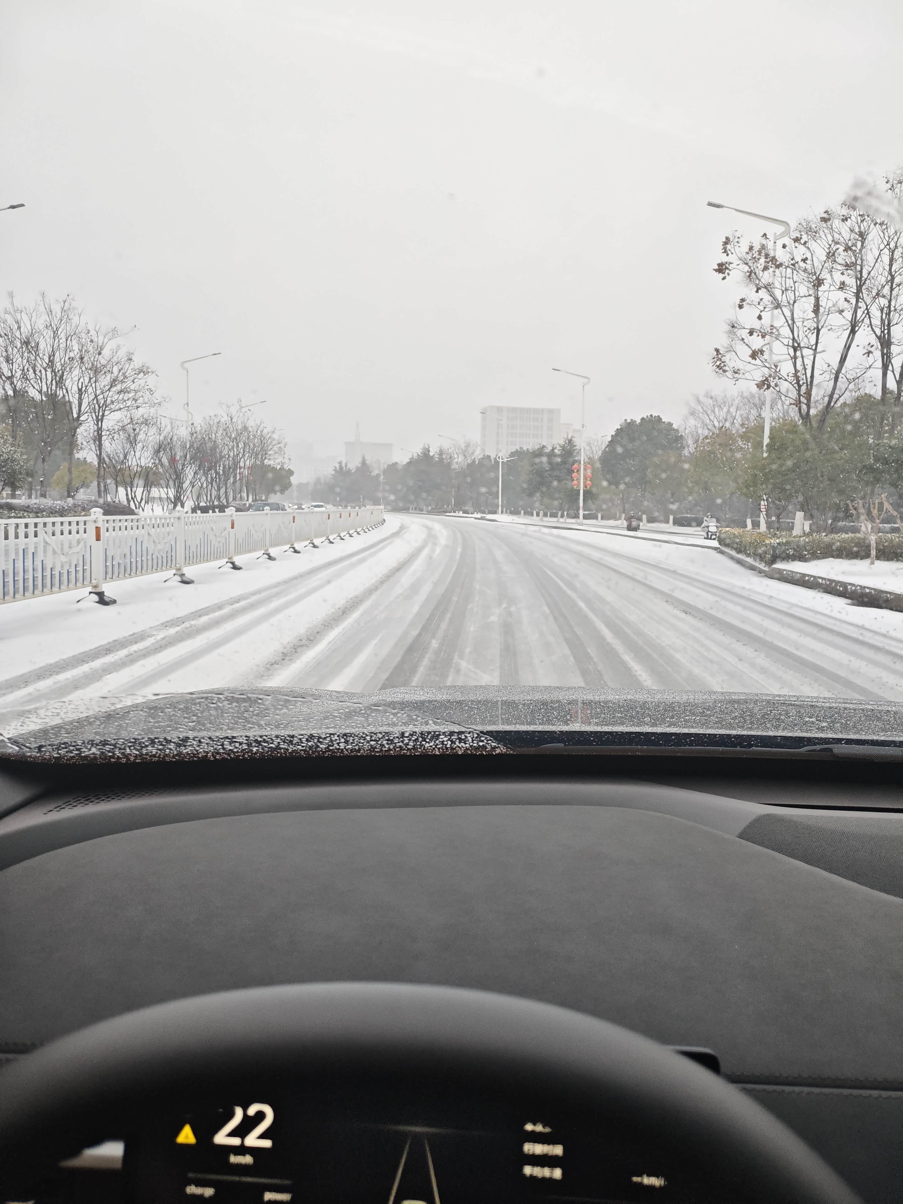 问了车友群说这个车没有雪地模式,开吧,慢慢开,时速30公里,到了等红绿灯时,起步一定要慢,因为胖8是后驱,会小滑,屏幕显示上都出小黄灯了,平时18公里开25分钟的路程,今天开了58分钟才到,还要感谢养护师傅,在桥梁的地方撒了盐,不然桥面上全是冰,