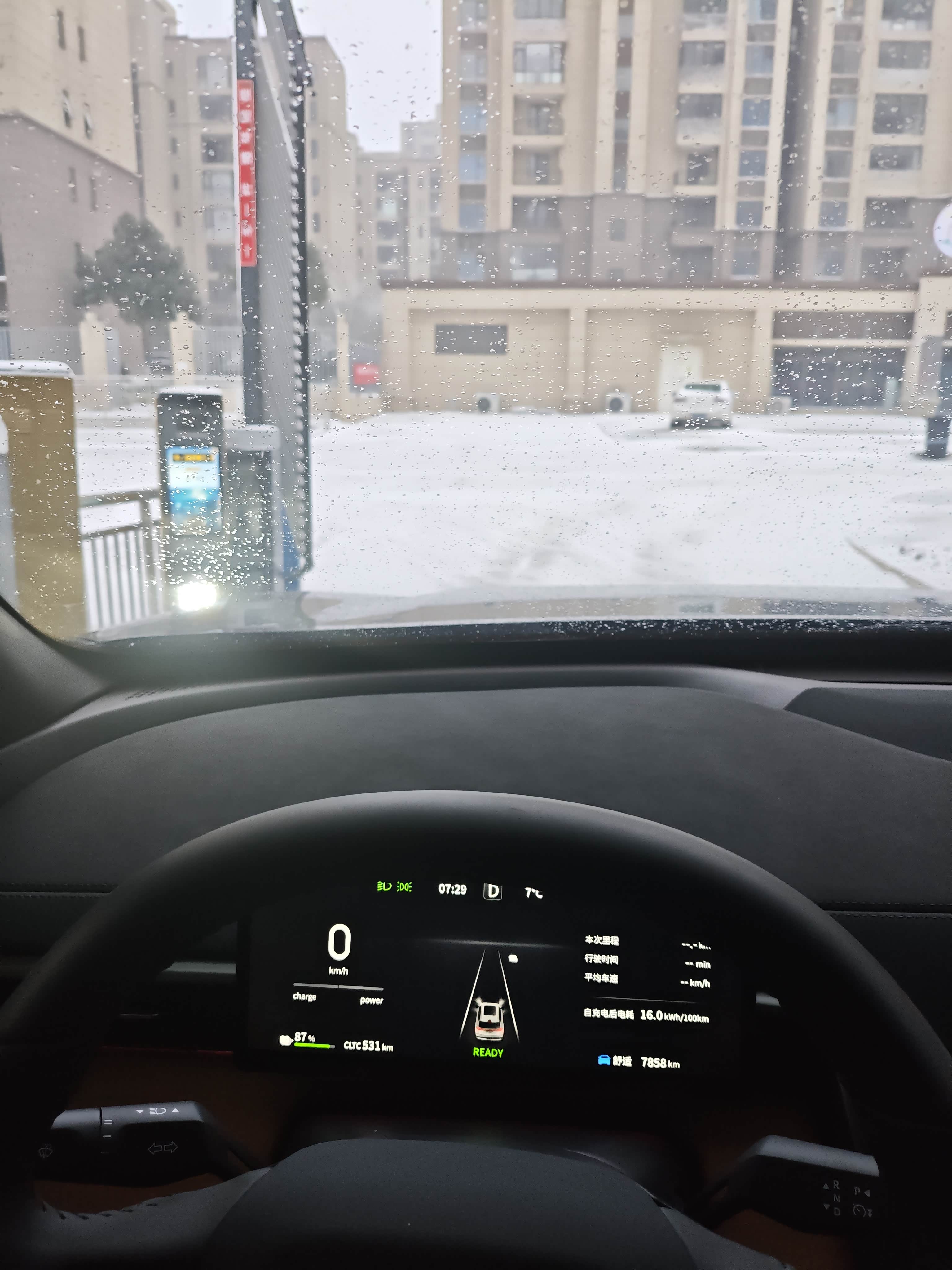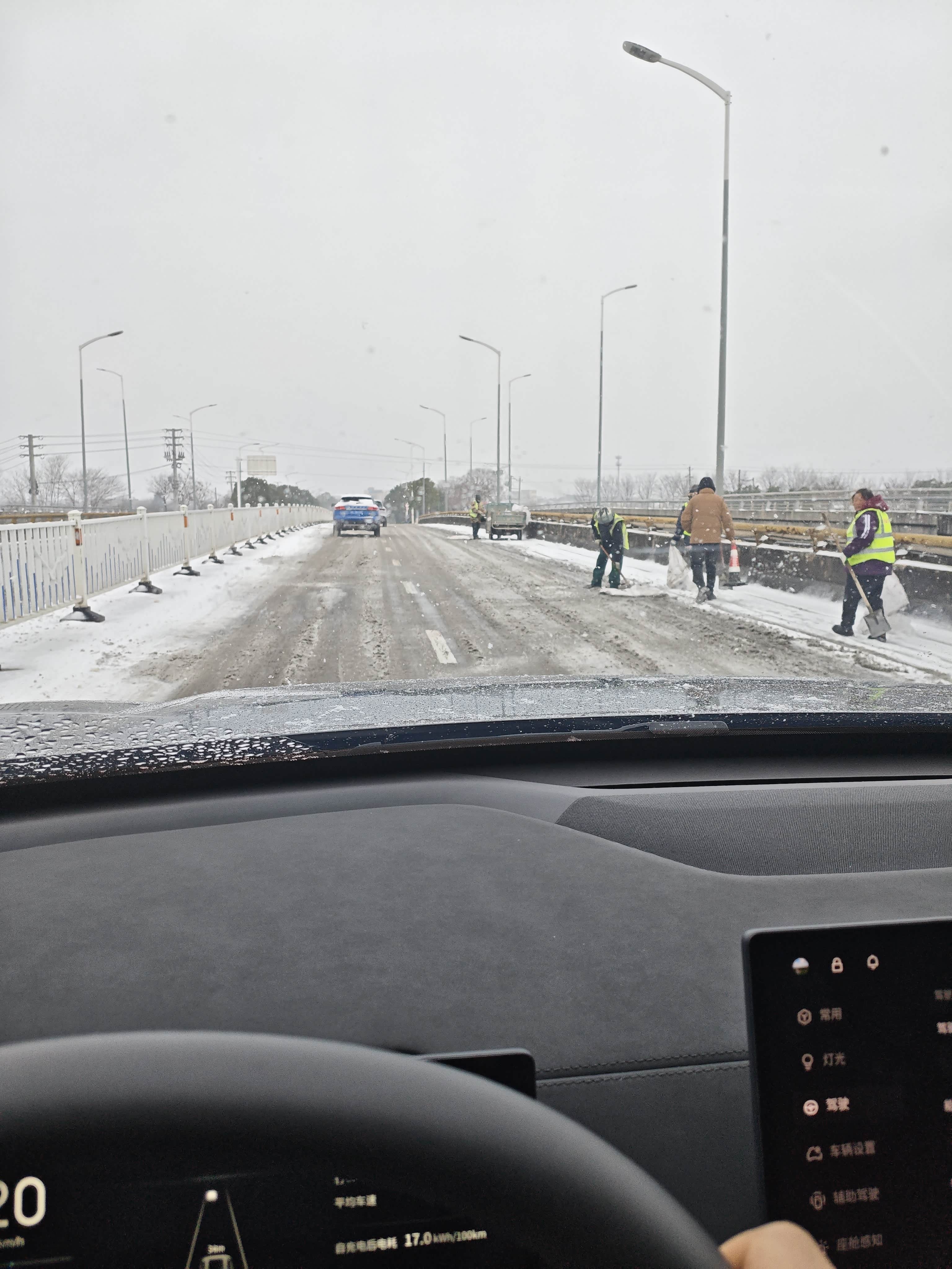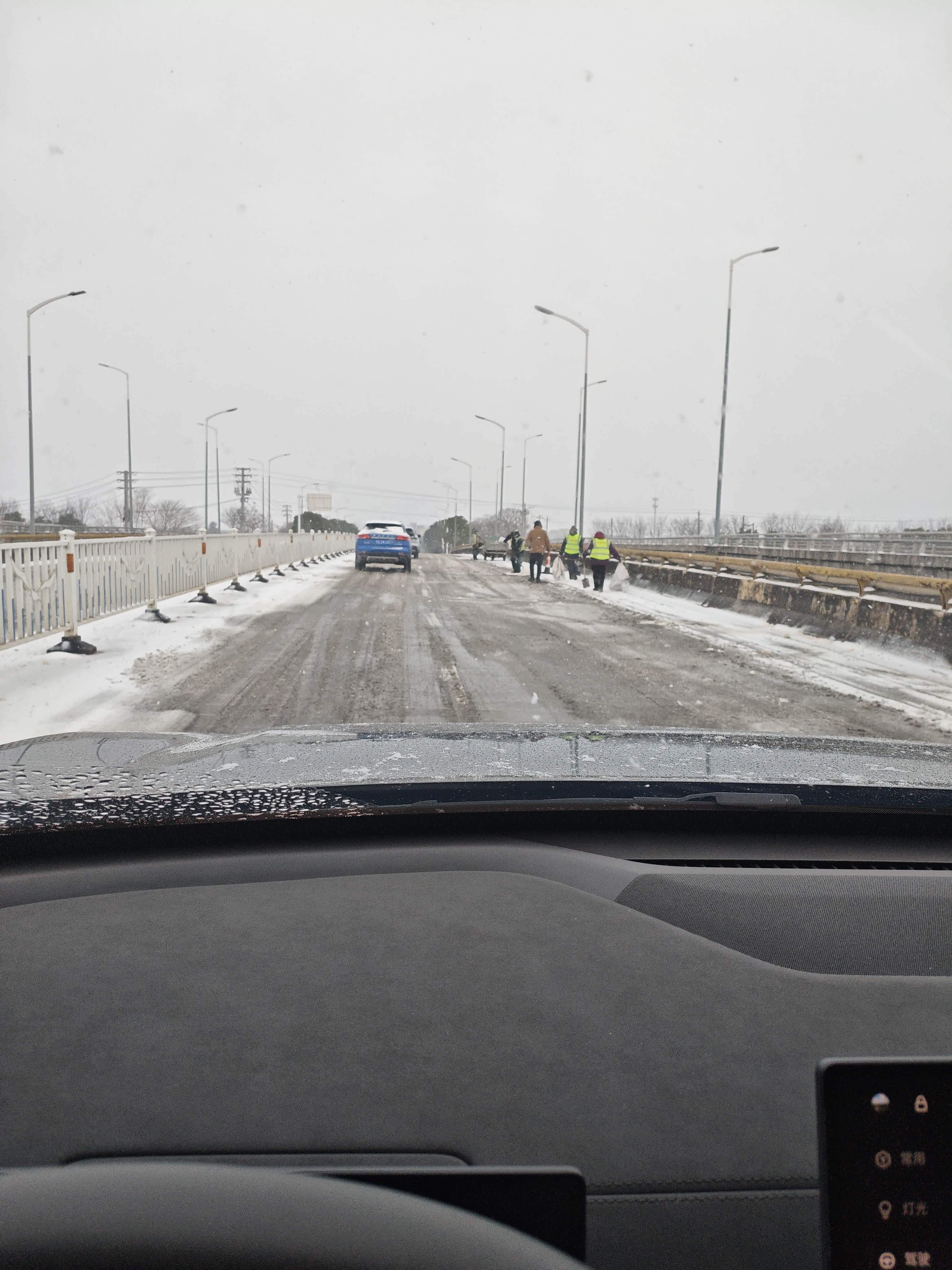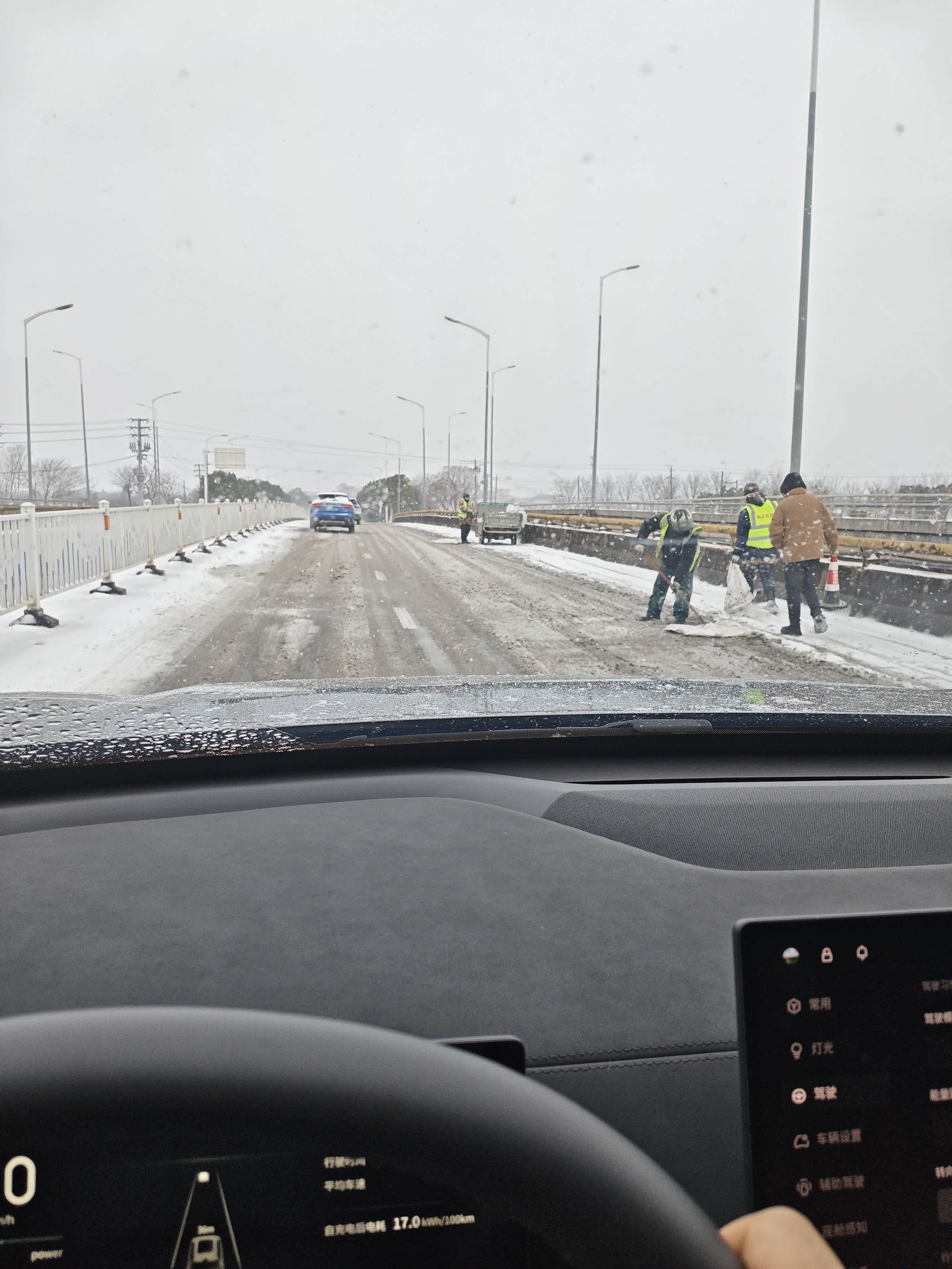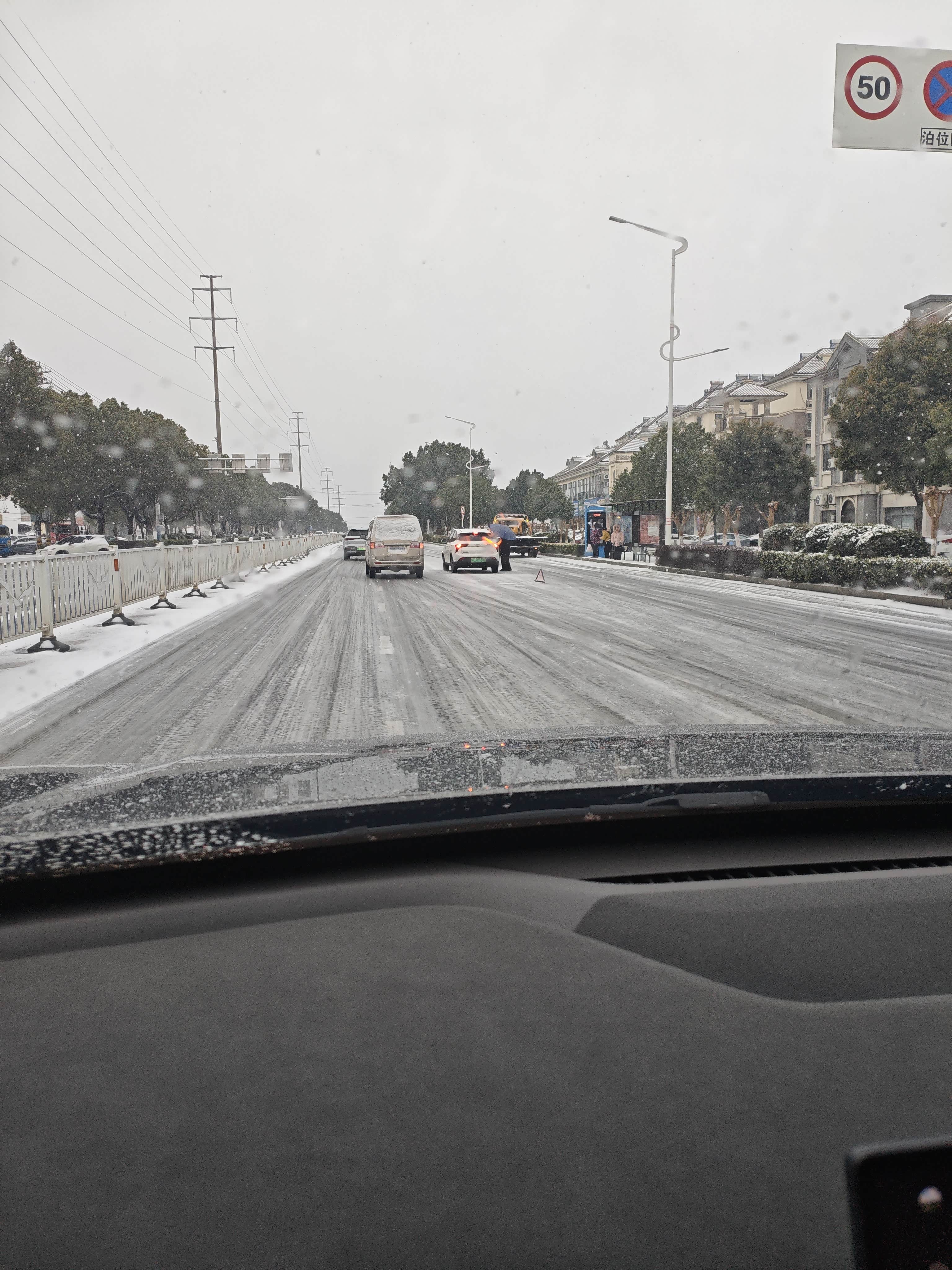 问了车友群说这个车没有雪地模式,开吧,慢慢开,时速30公里,到了等红绿灯时,起步一定要慢,因为胖8是后驱,会小滑,屏幕显示上都出小黄灯了,平时18公里开25分钟的路程,今天开了58分钟才到,还要感谢养护师傅,在桥梁的地方撒了盐,不然桥面上全是冰,