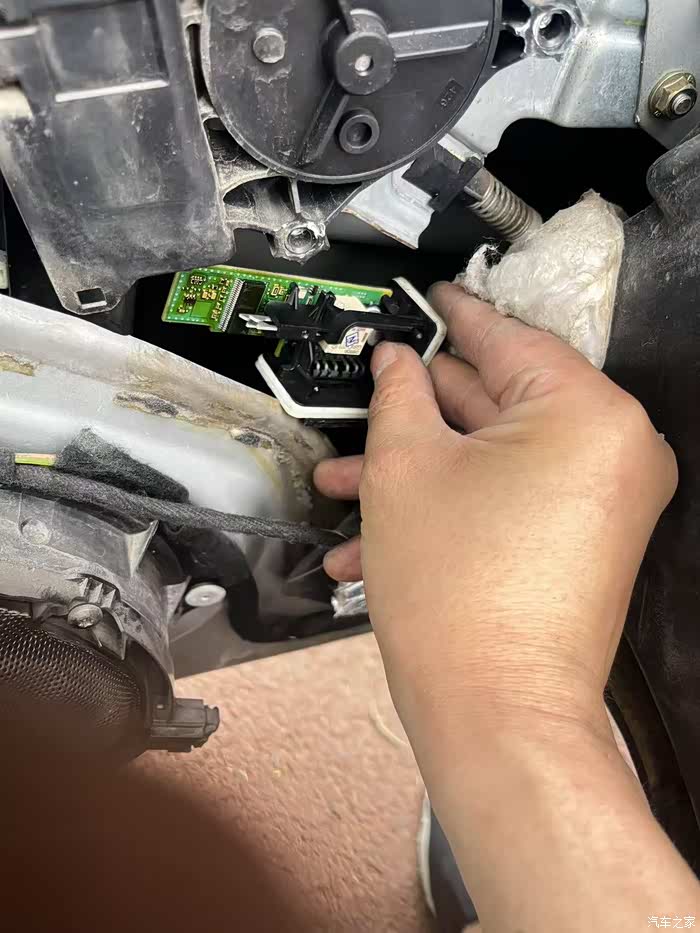 主驾不能控制其它三个,毫无疑问是网线信号出了问题,但断的可能性个人认为没有,将检查重点放在某个电机管制模块出了问题,选 拆了左后门,拔掉不能解决问题,然后拆右前门,拔掉电机插头,恢复正常控制,确定右前门出了问题。