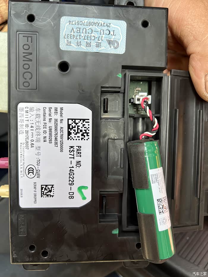 二、3月20日去朋友的修车档,最简单的推测是”车载无线终端“即TCU的电池坏了,换一个试试,这样成本最低。师傅拆除TCU与车子的连线后,把TCU取出,给那小电池拍照、记下型号(其实就是一节充电电池,当时小电池与TCU还是相连,未断电)。但在网上找不到相关的电池卖,闲鱼上也只有二手的”车载无线终端“即TCU卖,要四、五百块。想买一个,又怕买到的与自己车上的一样(当时以为可能是坏了),那不是多余来搞的。