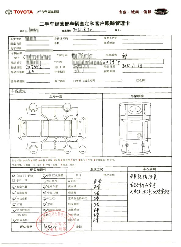 8月20日,我开着尊瑞去广汽丰田4S店给它做了二手车鉴定评估。经过评估师傅专业细致的鉴定,给出10.5万的二手车交易价。评估师还提及三个重点:第一,我的尊瑞车况非常好,算是极品车况,如果愿意可以马上交易;第二,如果是寄卖,价格有可能会再高2-3千元;第三,如果这台车电池没过8年20万公里的质保期,价格至少还可能增加1万元。