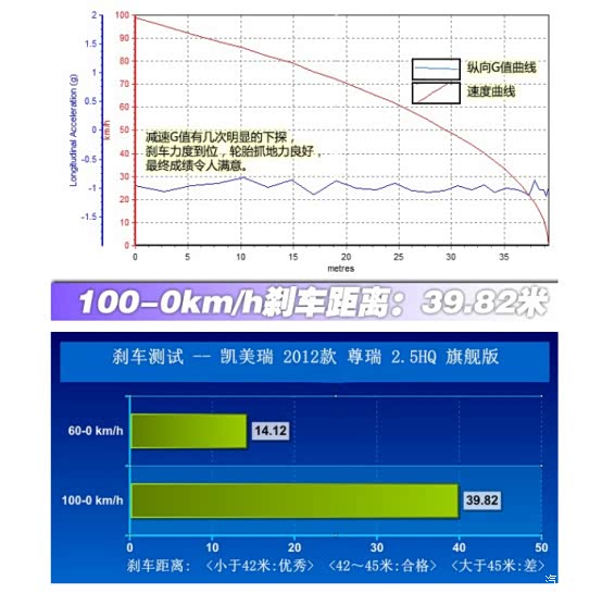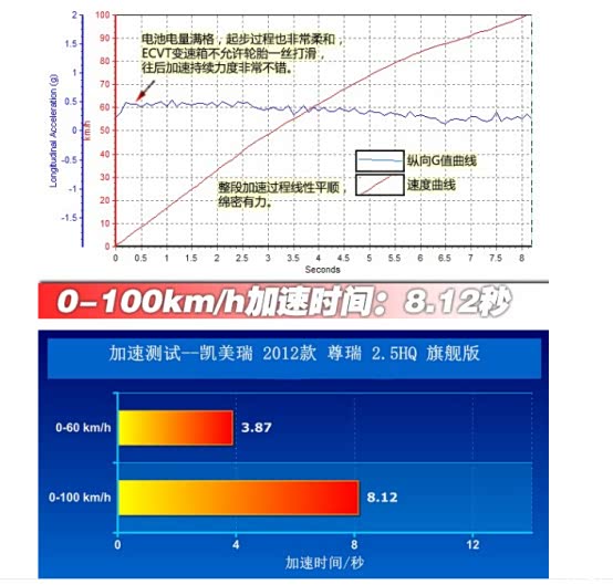 测试当天是晴天,气温30℃,路面为干燥柏油路。试车时尊瑞2.5HG动力电池显示电量为3格,实测0-100km/h加速为8.64秒。与汽车之家2013年测试过的新车数据比较,该平台信息显示,2012款尊瑞HQ顶配车型0-100km/h加速8.12秒(动力电池电量4格),车重1635kg(比尊瑞2.5HG重30kg)。考虑到我的尊瑞上放了一些日常随车物品,实际车重与平台测试的尊瑞HQ相当。