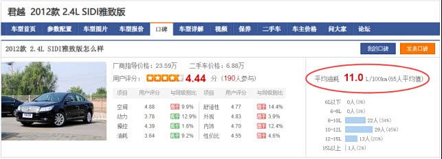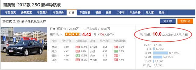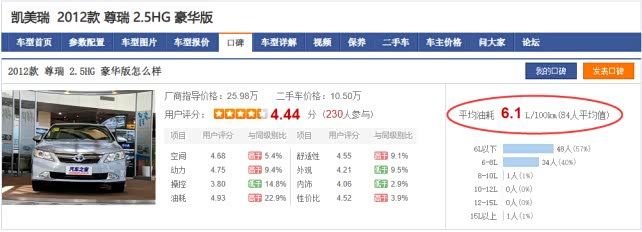 参考汽车之家的车主调研数据,2012款尊瑞2.5HG百公里油耗6.1L,与我的尊瑞相差不到0.3L,算得上非常真实的油耗数据了。