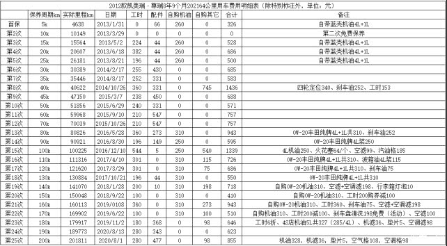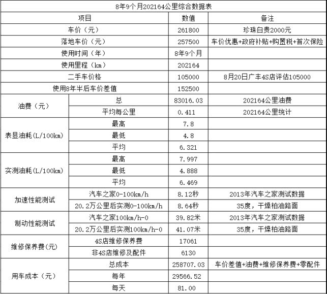从上面综合用车成本表中可以看出,尊瑞当时落地价25.75万元(包括新车优惠及广州市政府节能车补贴),按目前评估的二手车价格10.5万元计算,8年9个月行驶了202164公里,油费花了83016.03元,整个用车周期在4S店维修保养17061元,易损件及其他零部件费用6130元,维修保养成本合计23191元。