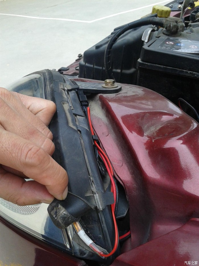取电说明:车电瓶边上有个中央控制盒(我是11款传奇,估计其他的款式也一样)找到点灯线圈的保险丝(这个接法是网上专家的接法噢)取上原来的15A保险丝插上网上买的取电线保险丝插上,用引出的电从中控盒底下小洞穿出来盖上中控盒盖子把电线接到LED的正级,LED的另一端接地就OK了。