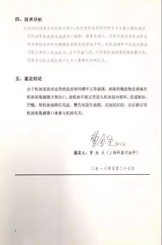 【AC汽车讯】6月2日消息,昨日下午途虎养车对外公布了“520机油维权”事件结果。途虎养车和车主成先生共同委托上海科鉴司法鉴定所的专家进行故障原因检测,上海科鉴司法鉴定所的专家曹金生在拆解发动机后,认定故障原因是车辆正时齿状传动皮带(简称“正时皮带”或“传动皮带”)碎屑掉落导致机油泵堵塞。同时检测报告显示,无油泥沉淀,无证据证明机油泵集滤器口堵塞与机油有关。