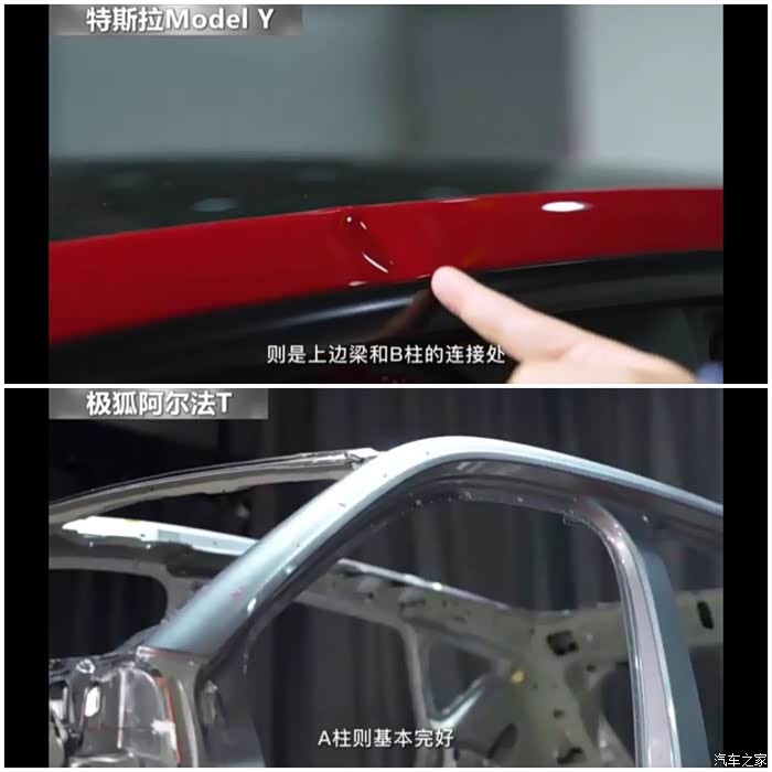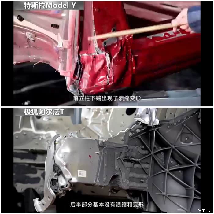 7、 特斯拉前立柱出现溃缩变形,A柱出现褶皱,极狐保持完整。