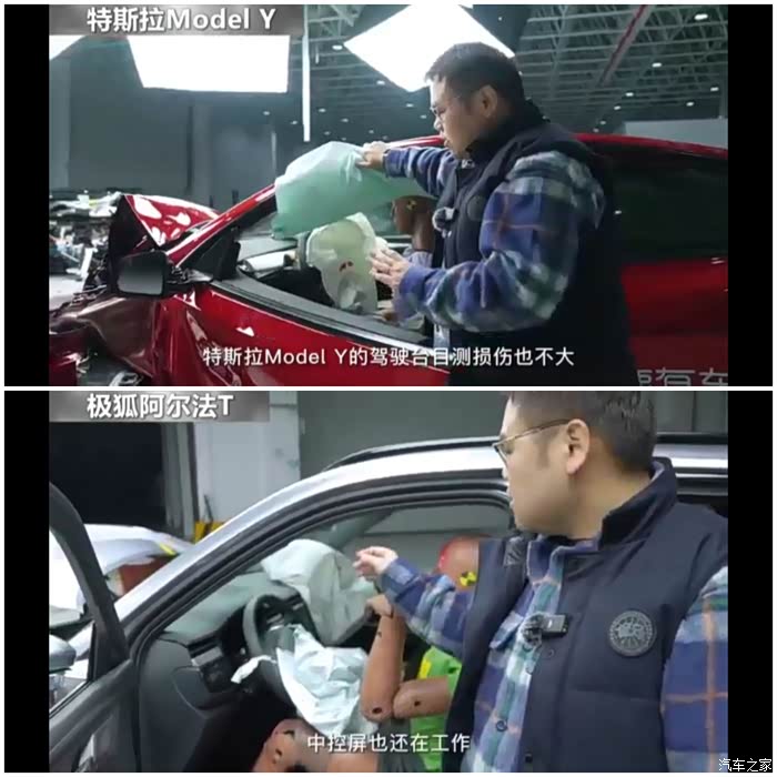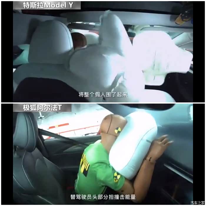 5、 两车气囊正常打开,极狐开启正面气囊,特斯拉不但开启正面及侧面气囊,中间气囊也打开了。