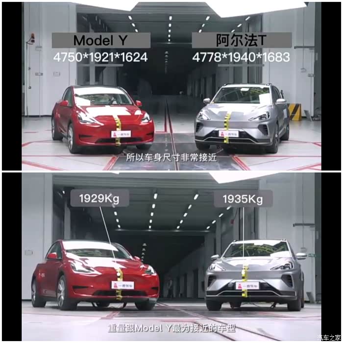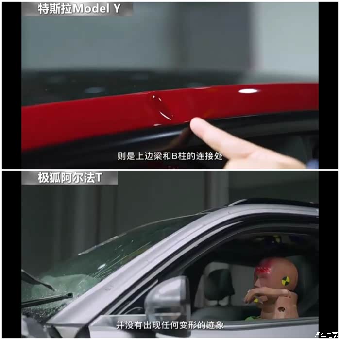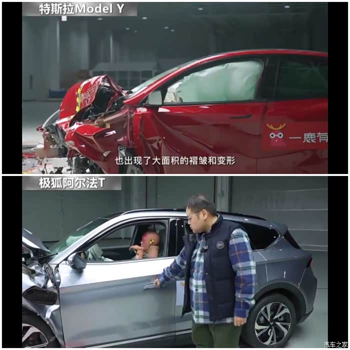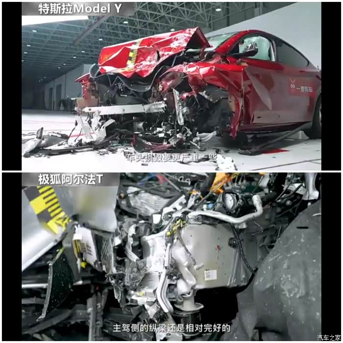 网上第一次出现了新能源车的碰撞试验,所选的车辆一个是销量之王且使用一体化车身的特斯拉Model Y,另一方是号称“刚性之王”,扭转刚度达55000的极狐阿尔法T,两车从尺寸和重量来看旗鼓相当,这次进行的是正面50%偏置对撞,时速60KM/H。对撞结果: