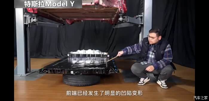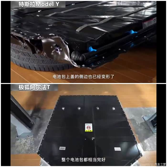 8、 特斯拉电池包受损,出现变形;极狐电池包完好。