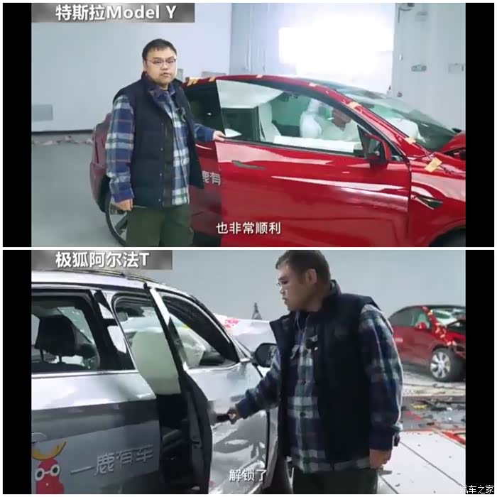 3、 两车车门都可以打开,极狐车门比较平整,车门打开与平常无异;特斯拉车门出现褶皱,打开车门需给予一定拉力。