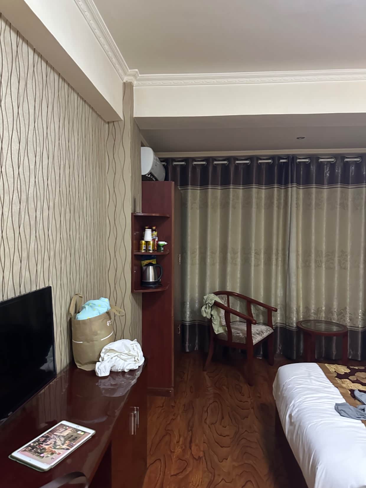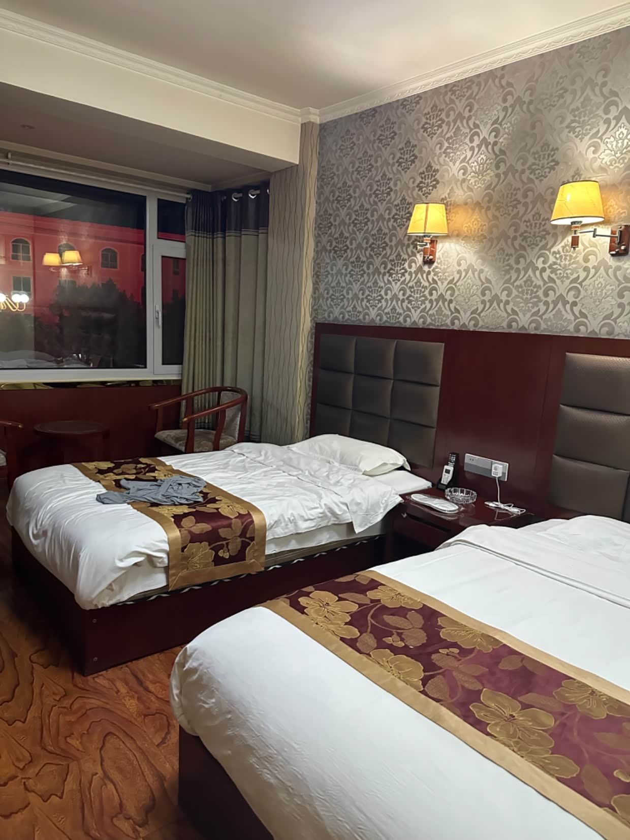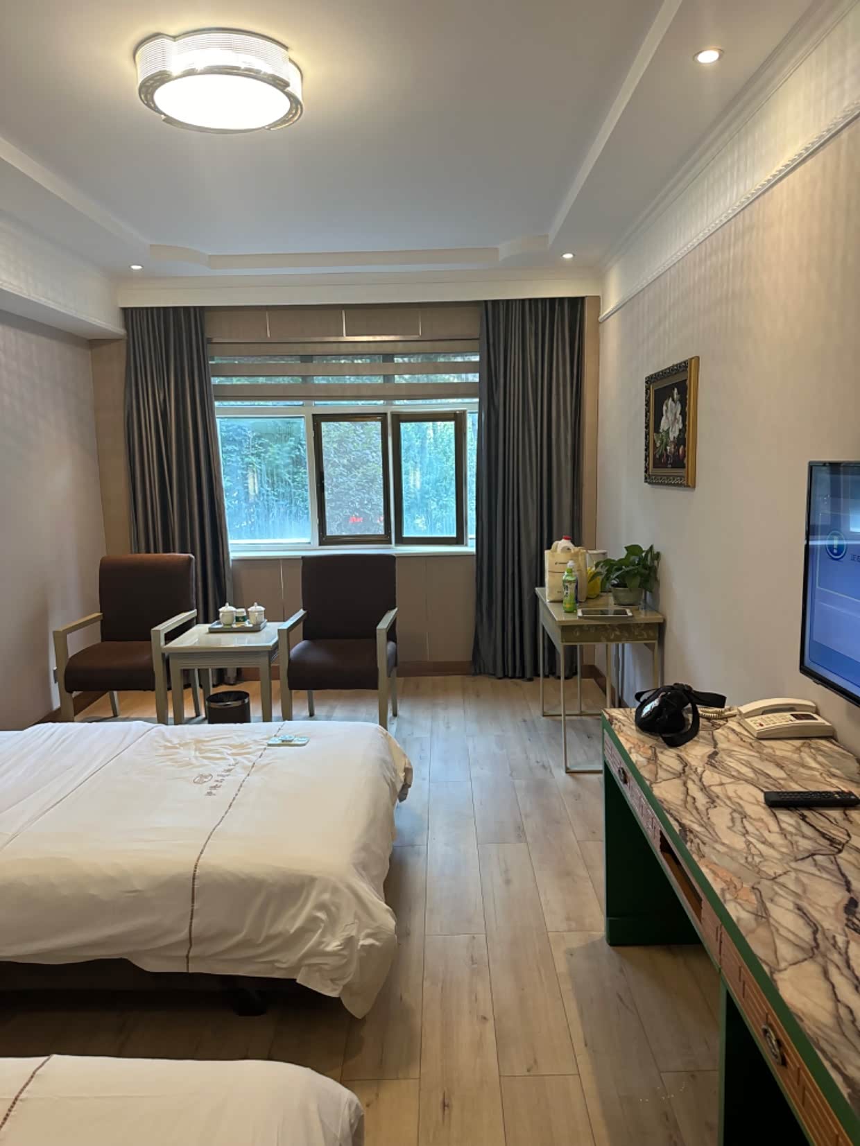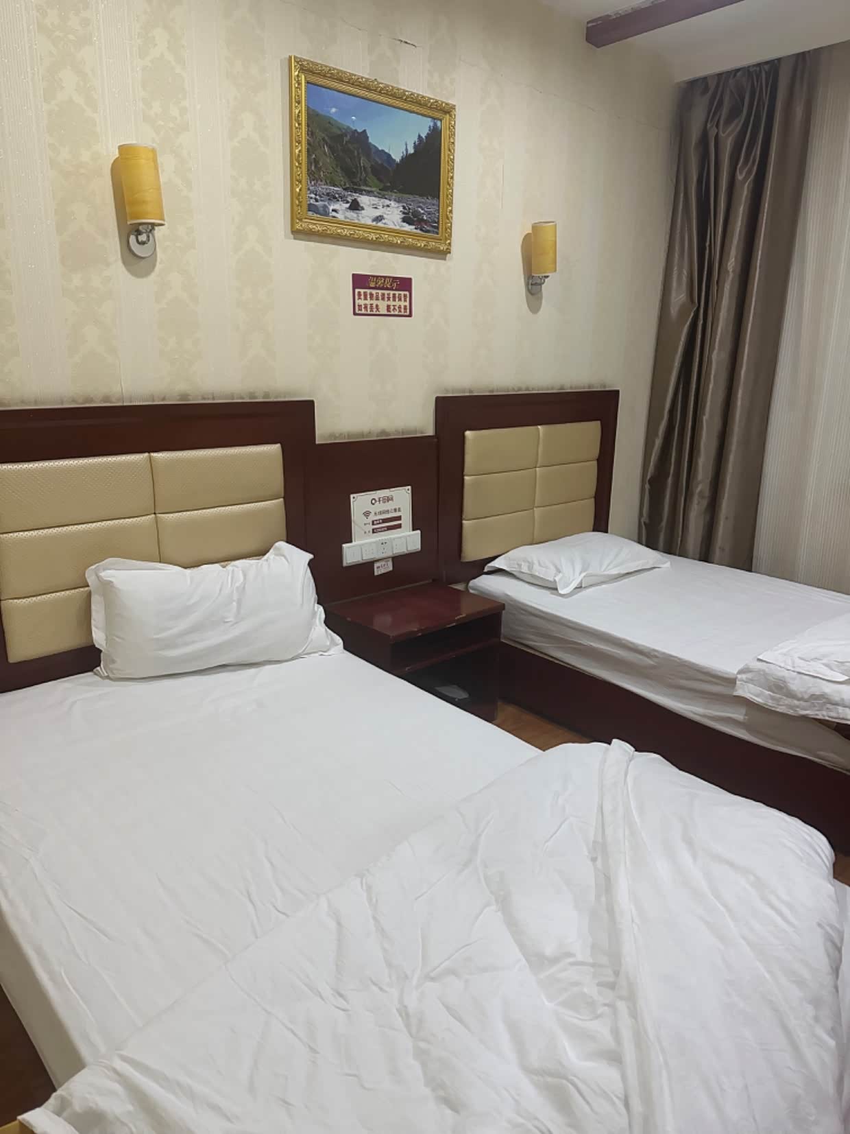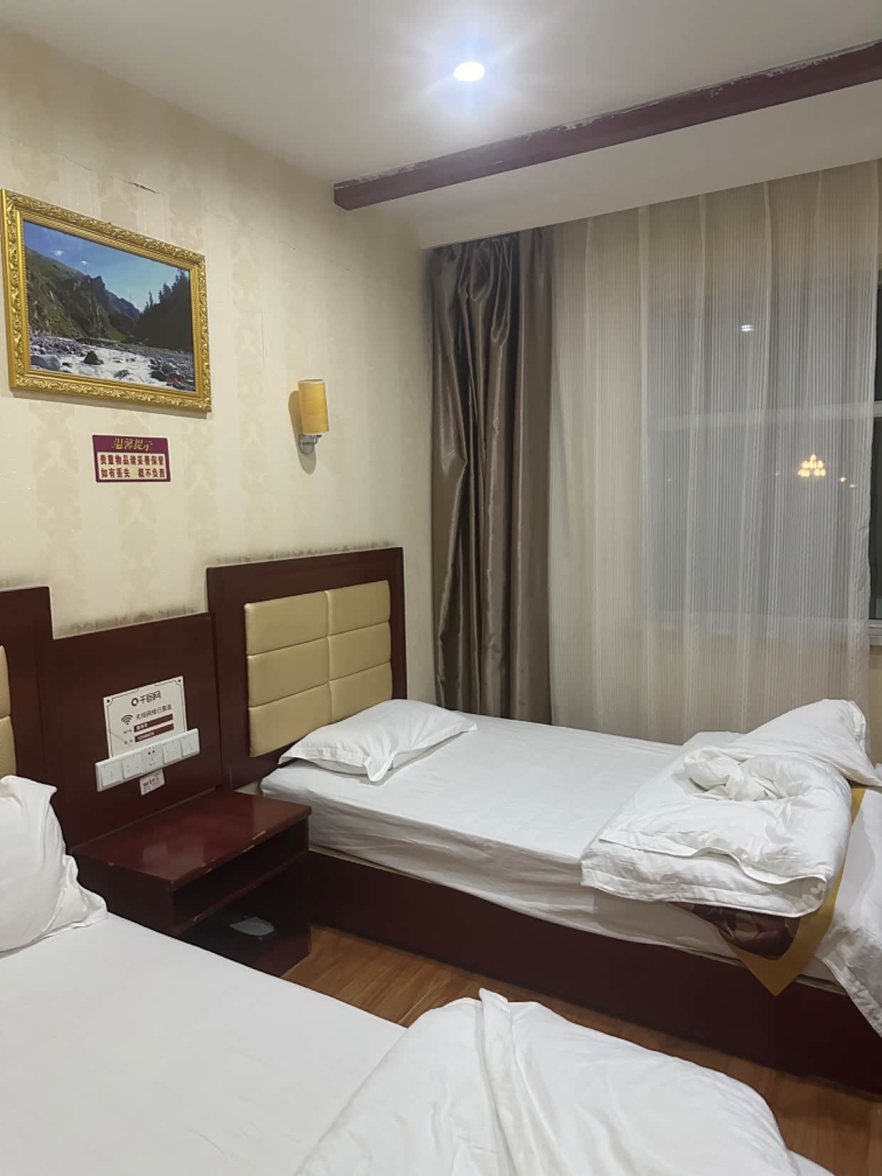 酒店停车在马路对面,过马路不安全也不太方便,没电梯没空调。西宁是很凉快,但室内还是热的,又热又闷。但房间定了,不能不住啊。结果晚上热的睡不着,没有空调很不习惯。开窗户稍好一点,但马路上噪音很大,晚上吵的睡不着,关上窗户屋里又很热,我到半夜3点还没睡着。建议去西宁旅行的朋友们,一定选择带空调 的酒店,没有空调我们睡不习惯的。反正我是特别后悔这一晚应该选择带空调的。本来就高反需要好好休息,结果热的睡不着,两个孩子也很是怕热,那就凑和睡吧。