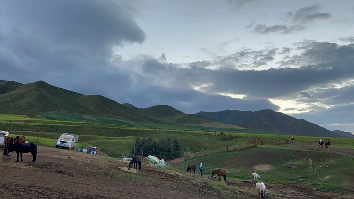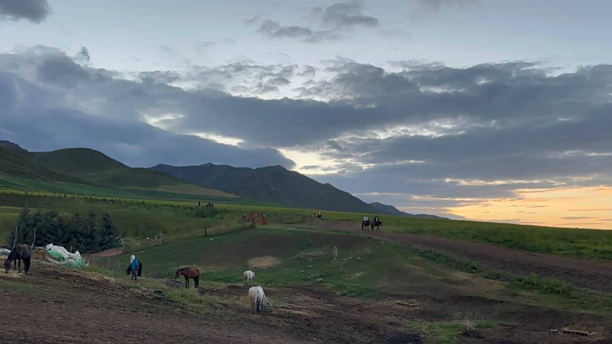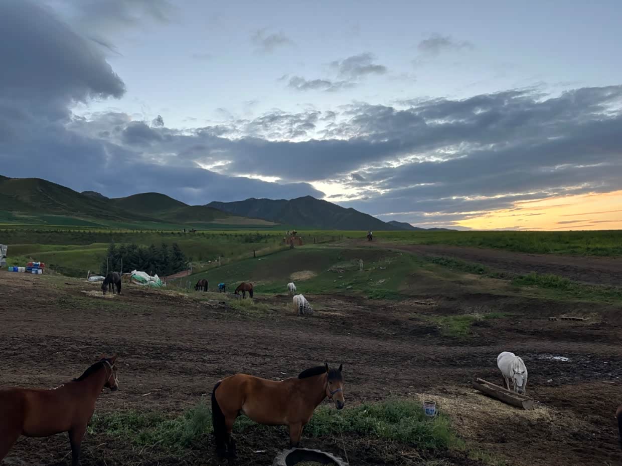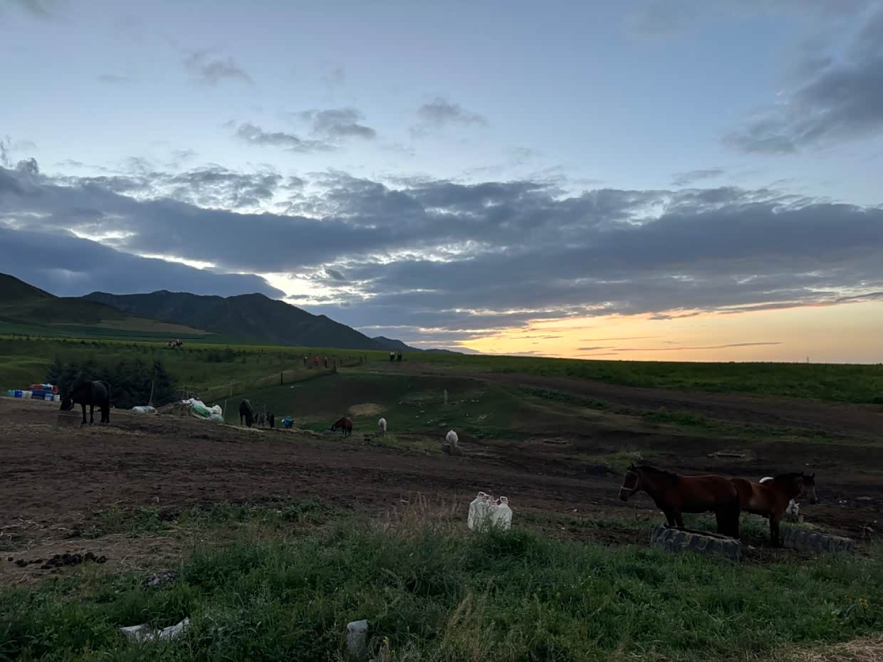 路遇扁都口,傍晚的草原和好多匹骏马,在夕阳的映衬下太美了。就像一幅画一样。