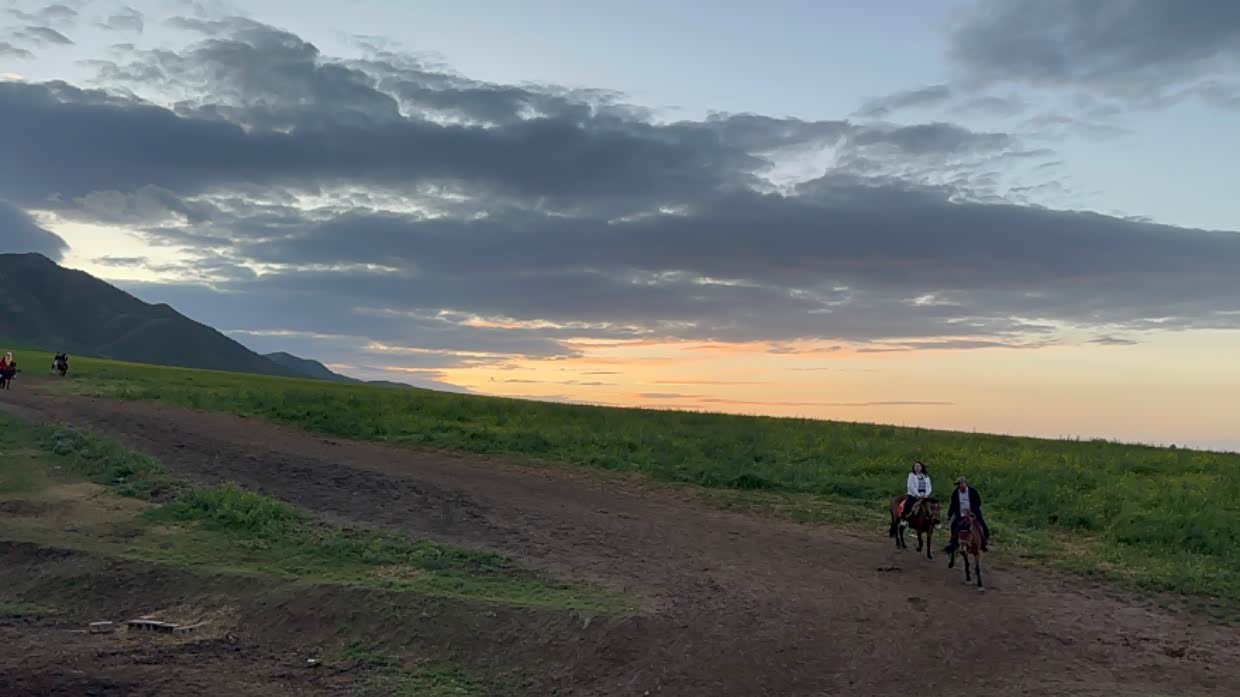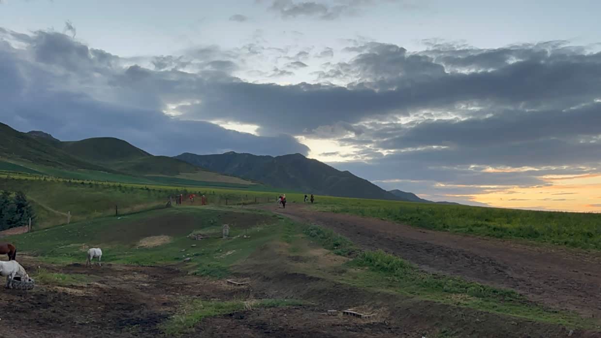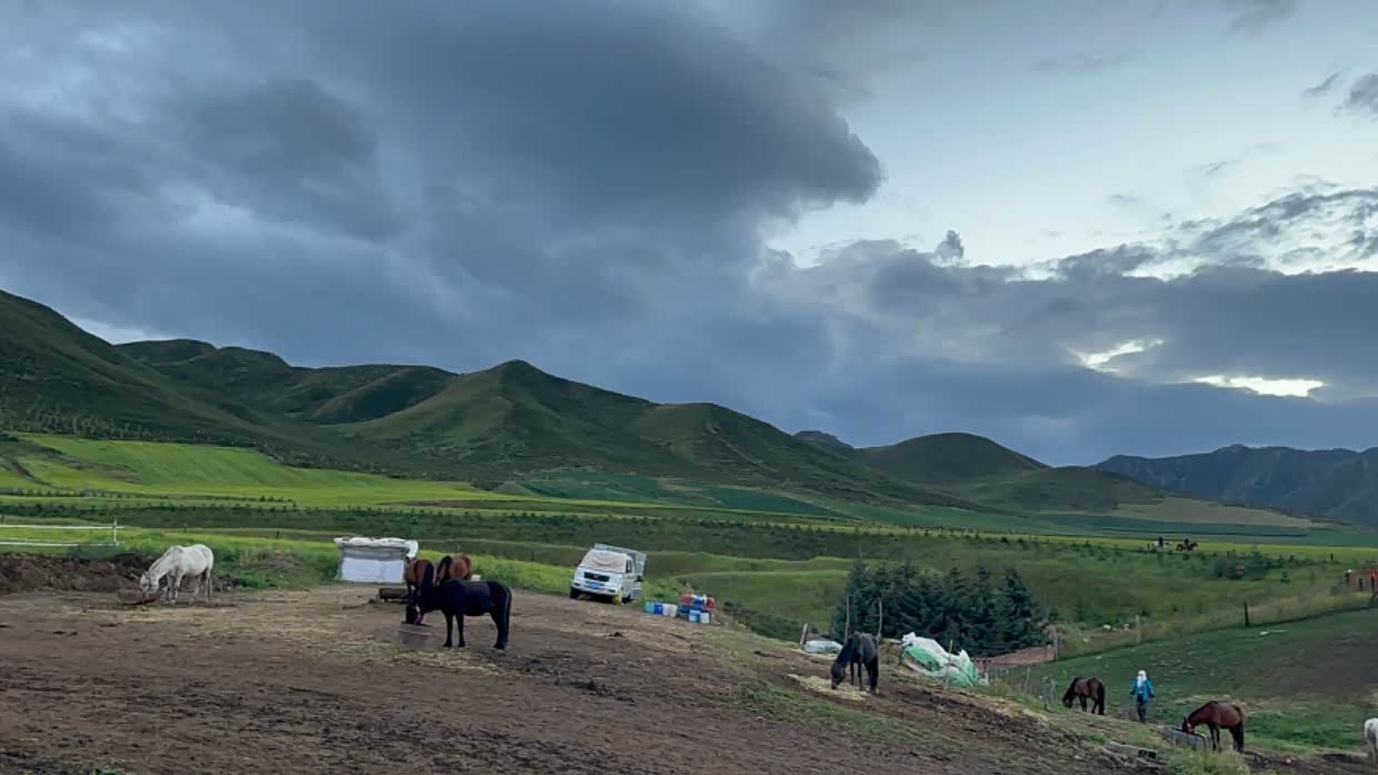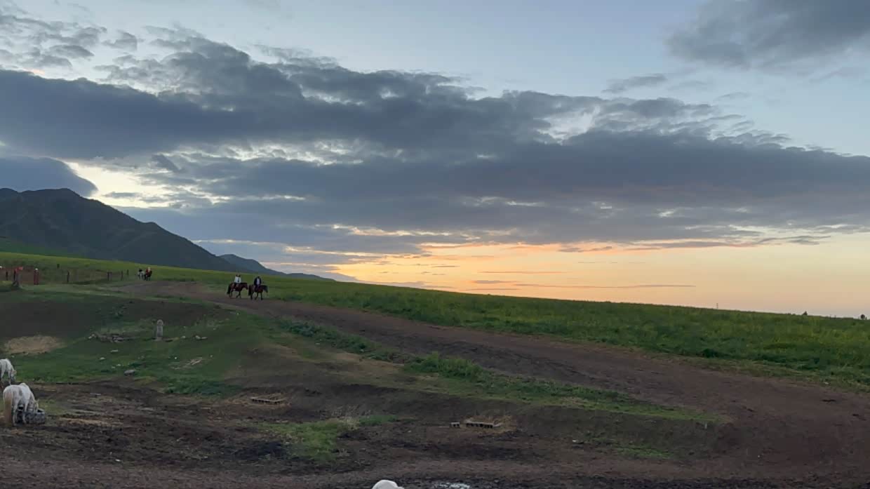 路遇扁都口,傍晚的草原和好多匹骏马,在夕阳的映衬下太美了。就像一幅画一样。