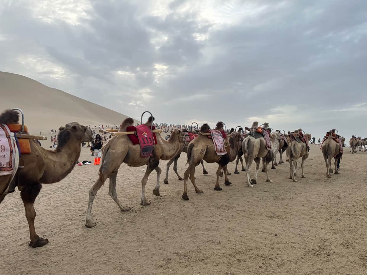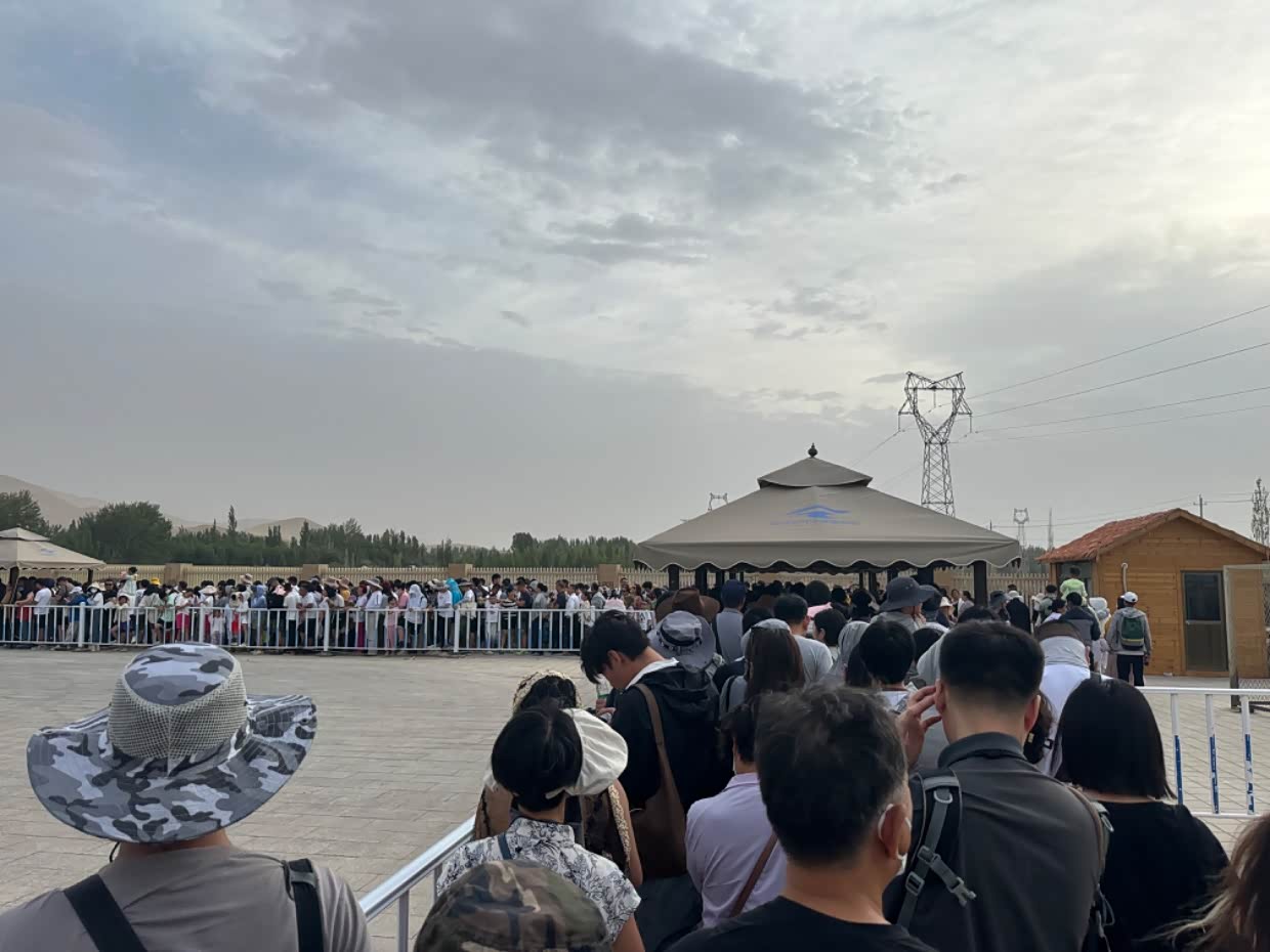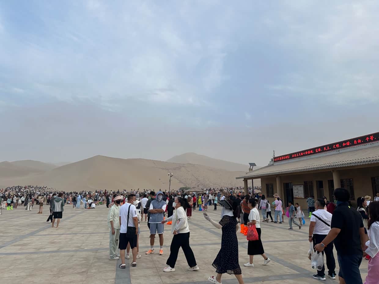 建议去鸣沙山旅游的亲们,一定提前准备几个口罩。风沙来的时候 管用的。回去时候电瓶车继续排队。身上到处是沙子,头发,脸上,耳朵里,都是,这就是精致的朋友圈,狼狈的自已。不过人生就是这样,多种经历未必是坏事,没有任何事情是圆满的,没有完美的,人生就应该 有多种体验。
