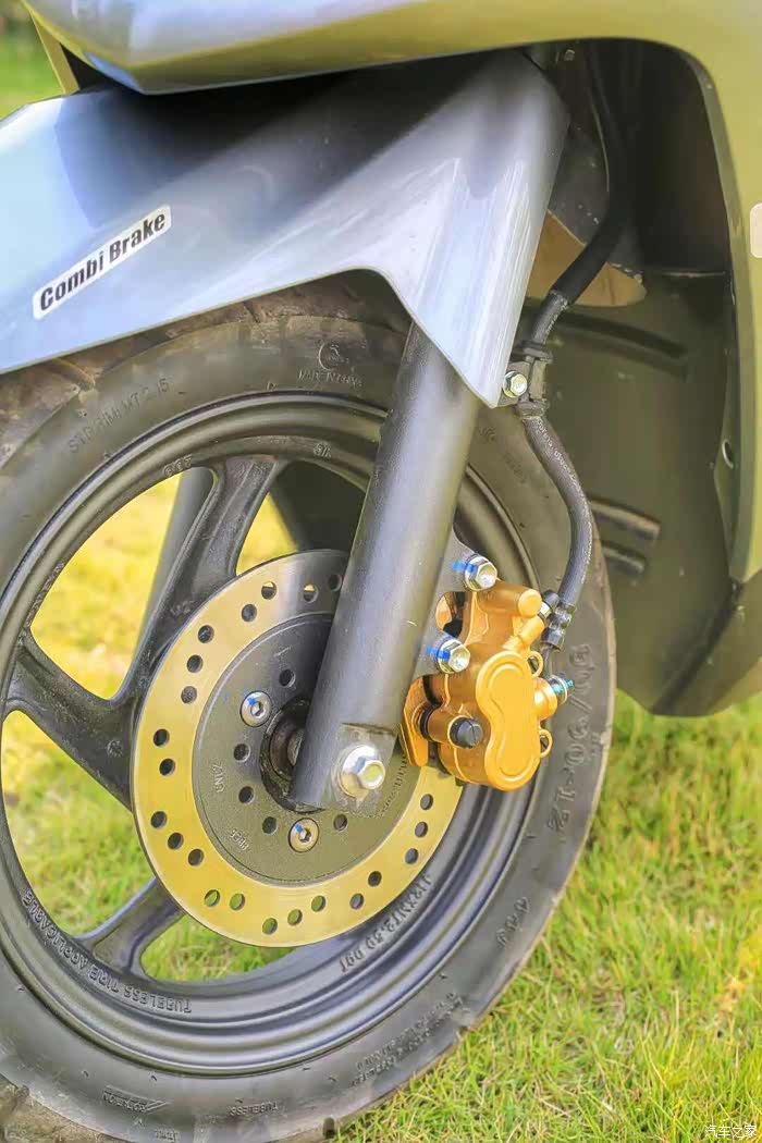刹车前碟后鼓配备了CBS联动刹车系统,增加骑乘安全性,轮胎原厂配的前90/90-12,后100/90-10国产诚远品牌,最直观的感受就是很滑非常滑,这副轮胎让整车的操控性大大减了分,目前正准备升级玛吉斯鲨鱼王W1,增加安全骑行的乐趣。