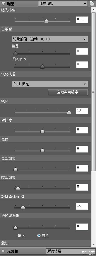 这个就是NX的精髓了,可以在拍完片子后,对曝光参数,白平衡数据等等,再进行修改。不同于PS的修改方法,更方便快捷。不过,只能修改NEF格式的相片。它可修改的范围,其实在相机本身也是可以设定的,只不过这里给了一次存档重来的机会罢了。所以我一直认为,用NX出图,应该算是直出。