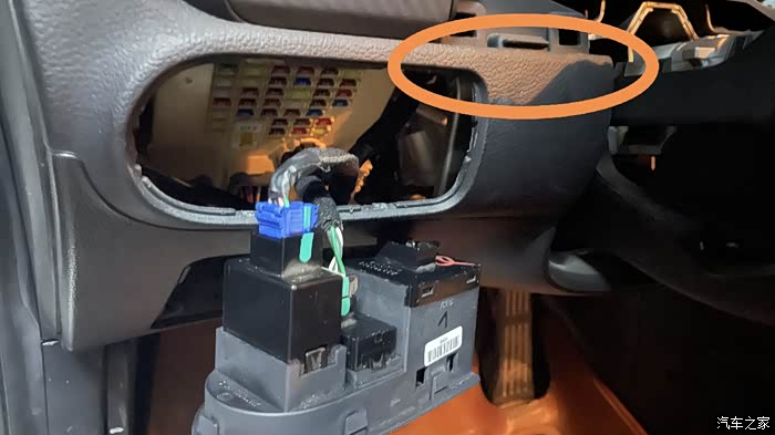 拆掉方向盘柱左右各一颗螺丝,把方向盘柱上护板撬开,左侧仪表调节开关扣出来,然后伸手从黄圈位置往外拉出来,得稍用点力,但不用撬板,车几乎无损。