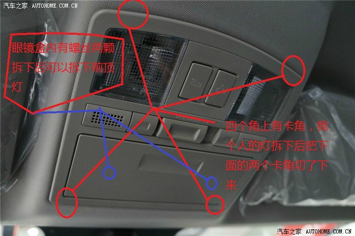 前头顶灯的四个角有卡角,拆装时很费劲,因为镜盒内有螺丝固定,所以我个人的前头顶灯镜盒端的卡角用钳子掰下来了,将来拆装方便 ,我用的是偏口钳子,不要用老虎钳,把灯弄坏我不负责哦。