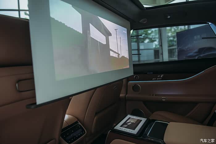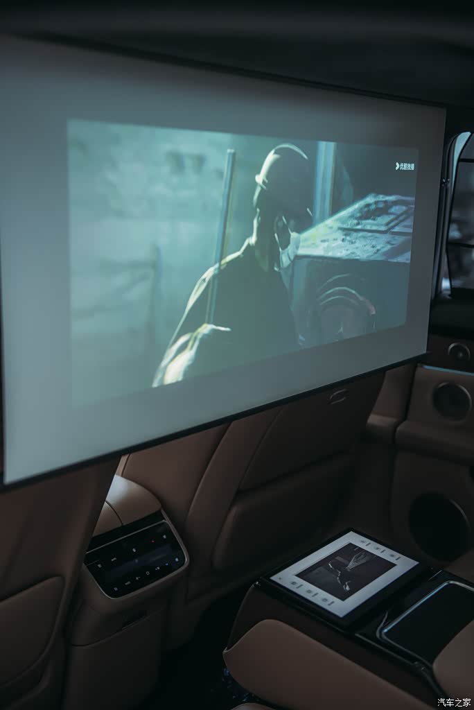 最“壕”无人性的配置,当属激光巨幕投影系统,32英寸的升降式巨幕,搭配全方位立体音箱和隐私遮阳帘,把后排打造成了私人巨幕影院。