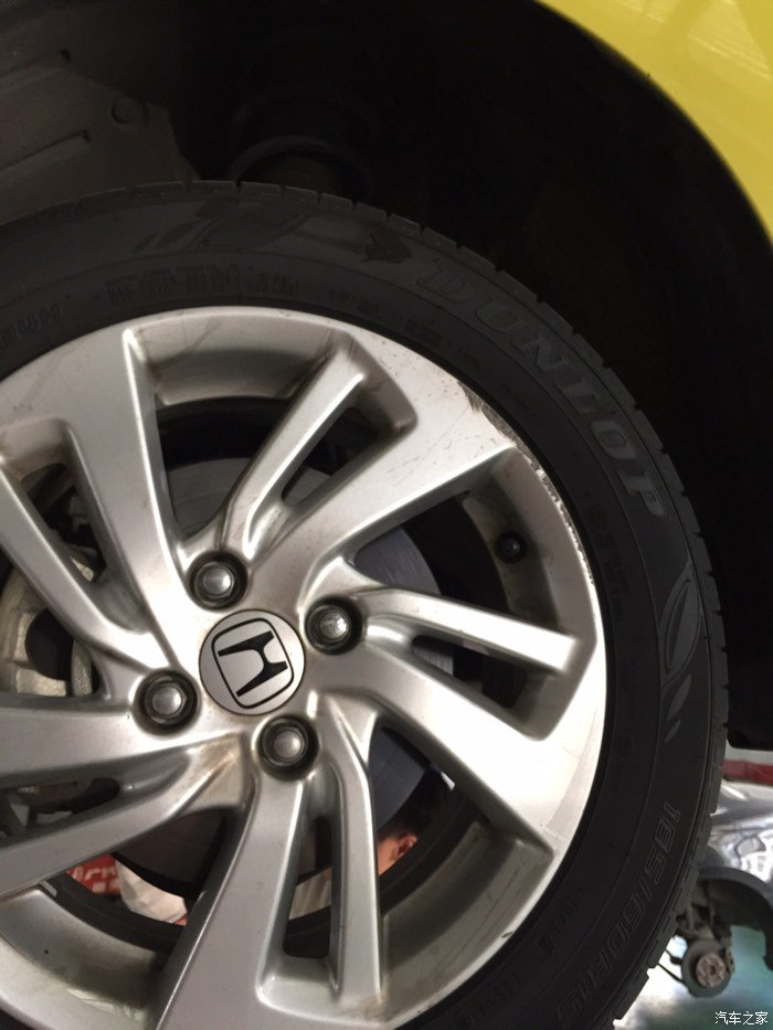 邓禄普的原厂胎,还有不经意间蹭花的轮毂(话说反正要换16的脚,随便用用吧)