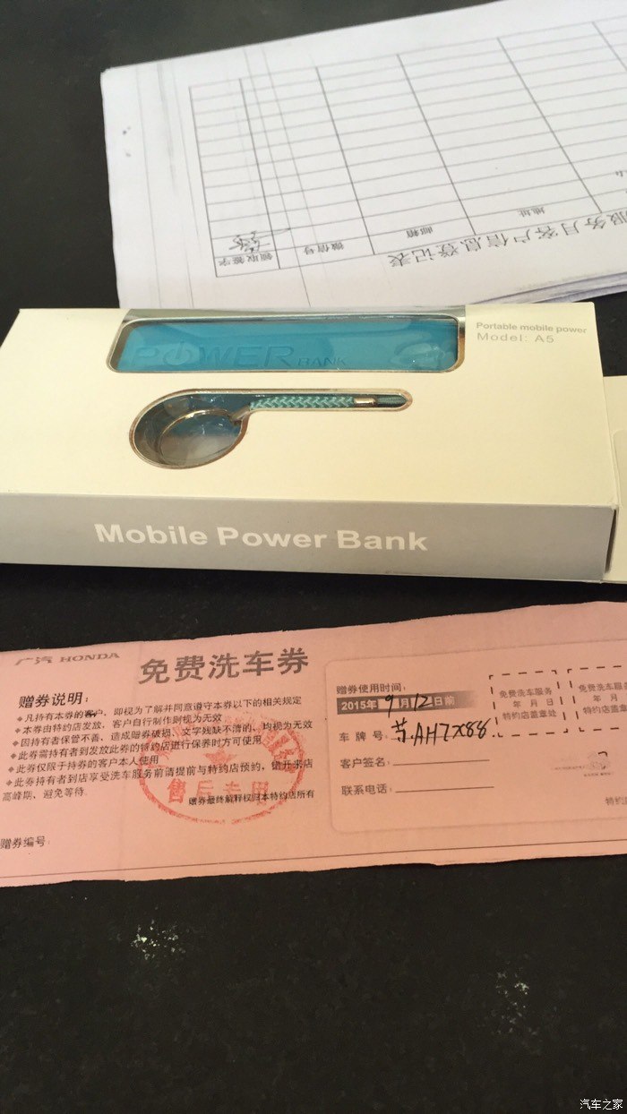 本月竟然还收到了礼物,免费洗车+一个移动电源。来谈一下吧,车子开到现在没发现过什么大的问题,经常看到的抖动熄火,我是一次没碰上过。小飞怎么说呢,对于一款日常代步家用的车子来说,他已经能够满足你的大部分条件了。无论是油耗,空间,动力,我觉得都很满足。这次保养的总费用也不贵。我觉得还是一辆值得购买的家用车,最后我要说一下,南京的小飞们还没加群的速度加了啊。群号是:334609975 我是49号,求认证啊!加个精就更好了!