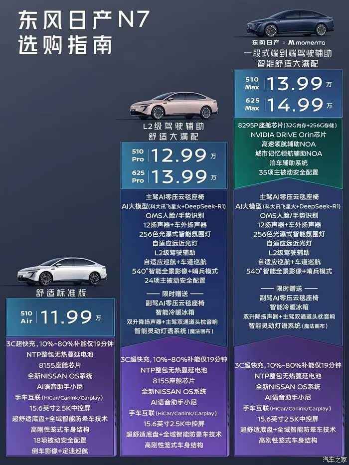 因为是天籁车主嘛,所以对东风日产各种新车动态还是非常关注的,那N7这台车呢是去年底在广州车展第一次亮相的,说实话这个外观你如果把车标遮起来,你怎么都猜不出这是东风日产的车,它真的变了,一点油味都没有。当时官方宣传的售价应该在20万左右,定位中高级纯电轿车。那这20万肯定是超出了我的购车预算的,不管你配置说的有多花里胡哨,什么ai零压云毯座椅,moment的辅助驾驶,带压缩机的冰箱,防晕车技术等等,你要卖20万,我是一点想法都不敢有啊…